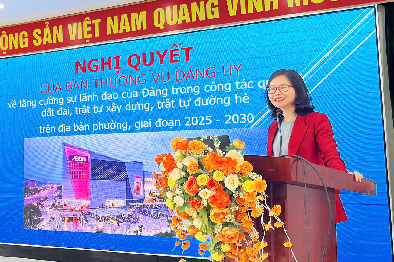 Đồng chí Vũ Thị Tố Nga, Phó Bí thư Thường trực Đảng ủy phường quán triệt tại Hội nghị.Tại Hội nghị, các đại biểu được nghe quán triệt: Nghị quyết số 01-NQ/ĐU, ngày 27/10/2025 “về xây dựng đội ngũ cán bộ cần, kiệm, liêm, chính, trí tuệ, gắn bó với Nhân dân”; Nghị quyết số 02-NQ/ĐU, ngày 05/11/2025 “về tăng cường sự lãnh đạo của Đảng trong công tác quản lý đất đai, trật tự xây dựng, trật tự đường hè trên địa bàn phường, giai đoạn 2025 - 2030’; Chỉ thị số 02-CT/ĐU, ngày 24/10/2025 “về lãnh đạo, chỉ đạo công tác bầu cử đại biểu Quốc hội khoá XVI và đại biểu HĐND các cấp nhiệm kỳ 2026 - 2031”; triển khai Kế hoạch của Đảng ủy phường về thực hiện mô hình “Chi bộ bốn tốt”, “Đảng bộ cơ sở bốn tốt”; và việc lấy ý kiến của cán bộ, đảng viên và nhân dân tham gia đóng góp vào các dự thảo văn kiện Đại hội XIV của Đảng qua ứng dụng VNeID.
