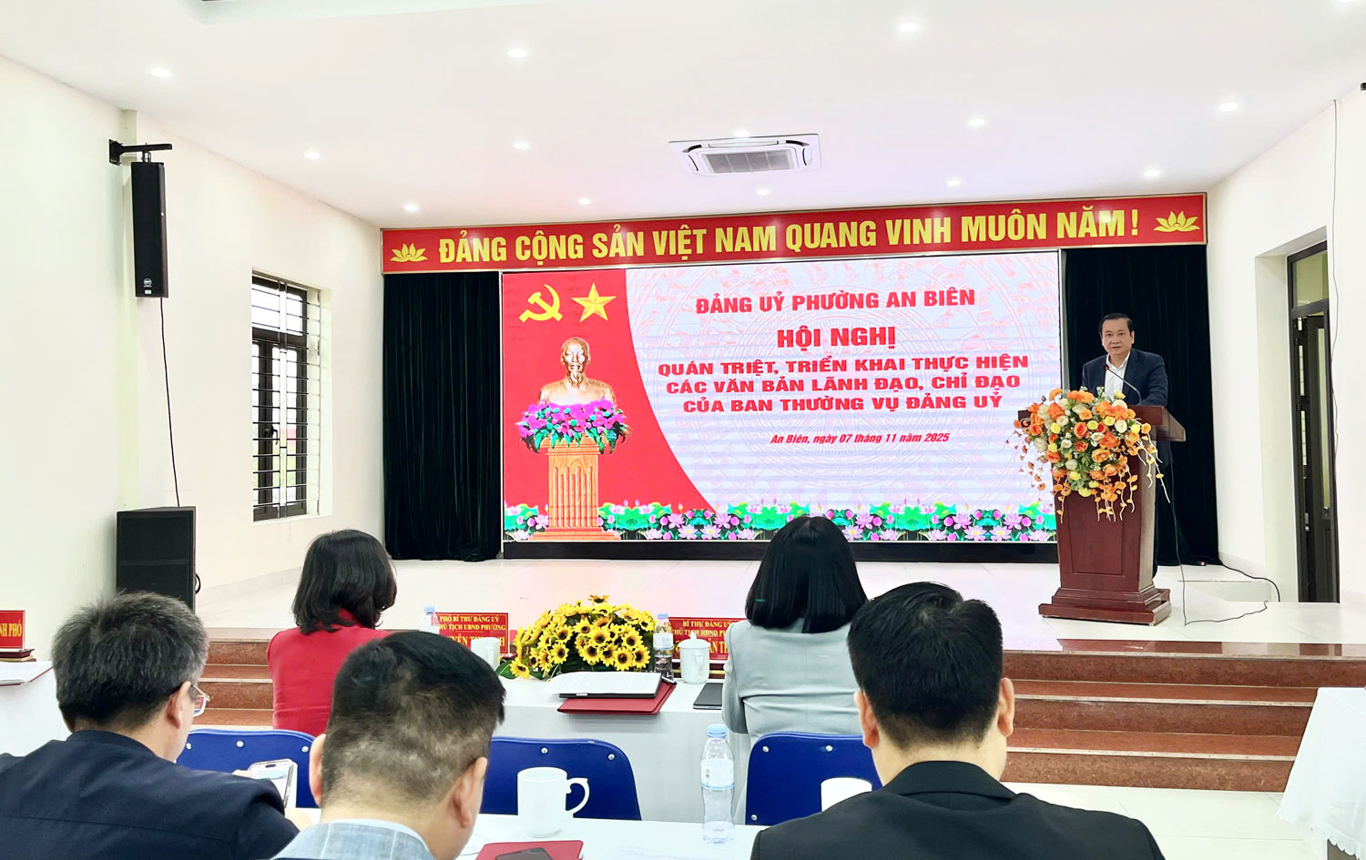 (Haiphong.gov.vn) - Sáng 7/11, Đảng ủy phường An Biên tổ chức Hội nghị quán triệt, triển khai thực hiện các văn bản lãnh đạo, chỉ đạo quan trọng của Ban Thường vụ Đảng ủy phường nhằm cụ thể hóa các chủ trương, Nghị quyết, Chỉ thị của cấp ủy, đáp ứng yêu cầu nhiệm vụ trong giai đoạn hiện nay. Đồng chí Nguyễn Văn Thành, Bí thư Đảng ủy, Chủ tịch HĐND phường chủ trì Hội nghị.