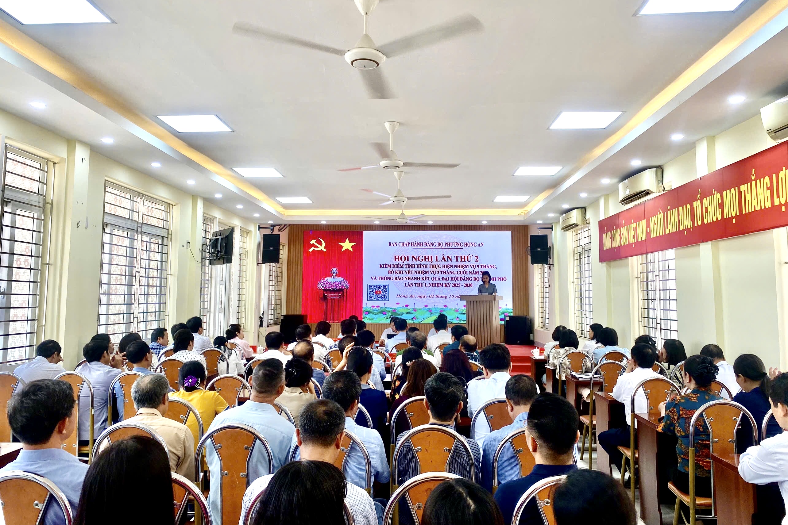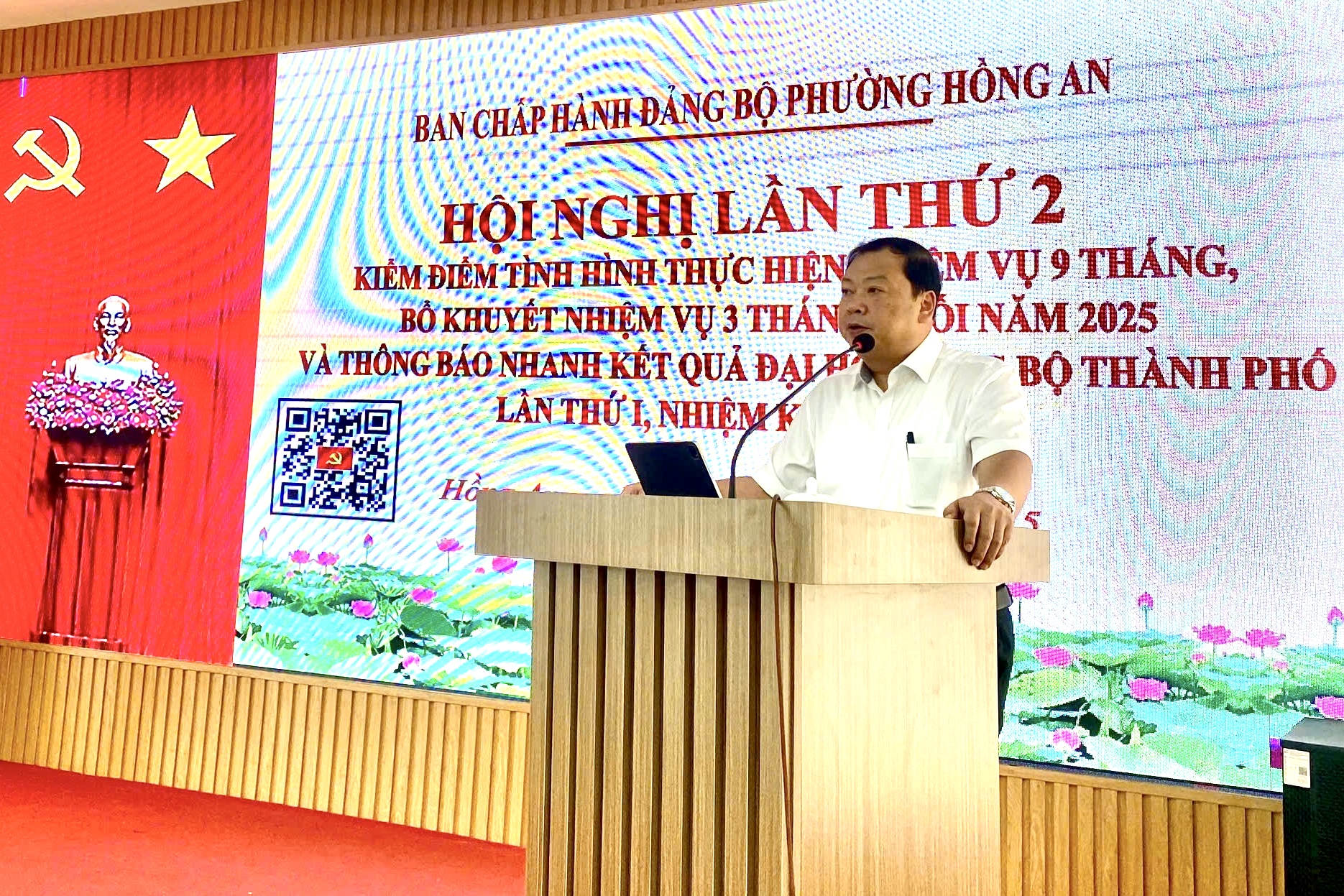 (Haiphong.gov.vn) - Chiều 2/10, Đảng ủy phường Hồng An tổ chức Hội nghị Ban Chấp hành lần thứ 2 đánh giá, kiểm điểm tình hình thực hiện nhiệm vụ 9 tháng; triển khai nhiệm vụ, giải pháp trọng tâm 3 tháng cuối năm 2025 và thông báo nhanh kết quả Đại hội Đảng bộ thành phố lần thứ I, nhiệm kỳ 2025 - 2030. Đồng chí Đỗ Việt Hưng, Bí thư Đảng ủy, Chủ tịch HĐND phường Hội nghị.
