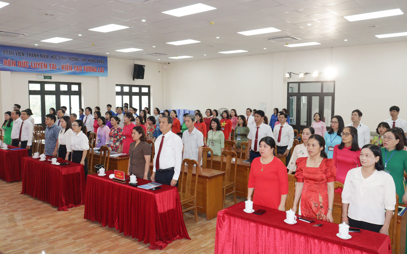 Các đại biểu làm Lễ chào cờ.Tại buổi Lễ đã công bố Quyết định của Ban Thường vụ Quận ủy Hồng Bàng về việc kết nạp 04 học sinh ưu tú vào hàng ngũ của Đảng Cộng sản Việt Nam. Các em đều là những học sinh xuất sắc tiêu biểu, tích cực tham gia các hoạt động trong công tác đoàn và phong trào thanh niên của nhà trường và địa phương. Các quần chúng trải qua thời gian dự bị 12 tháng tính từ ngày tổ chức Lễ kết nạp.