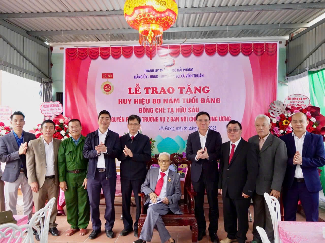 (Haiphong.gov.vn) – Chiều 1/11, đồng chí Đào Trọng Đức, Ủy viên Ban Thường vụ Thành ủy, Phó Chủ tịch HĐND thành phố, đã tới dự và trao Huy hiệu 80 năm tuổi Đảng tặng đồng chí Tạ Hữu Sáu, nguyên Phó Vụ trưởng Vụ 2, Ban Nội chính Trung ương, tại nhà riêng ở thôn 7, xã Vĩnh Thuận.