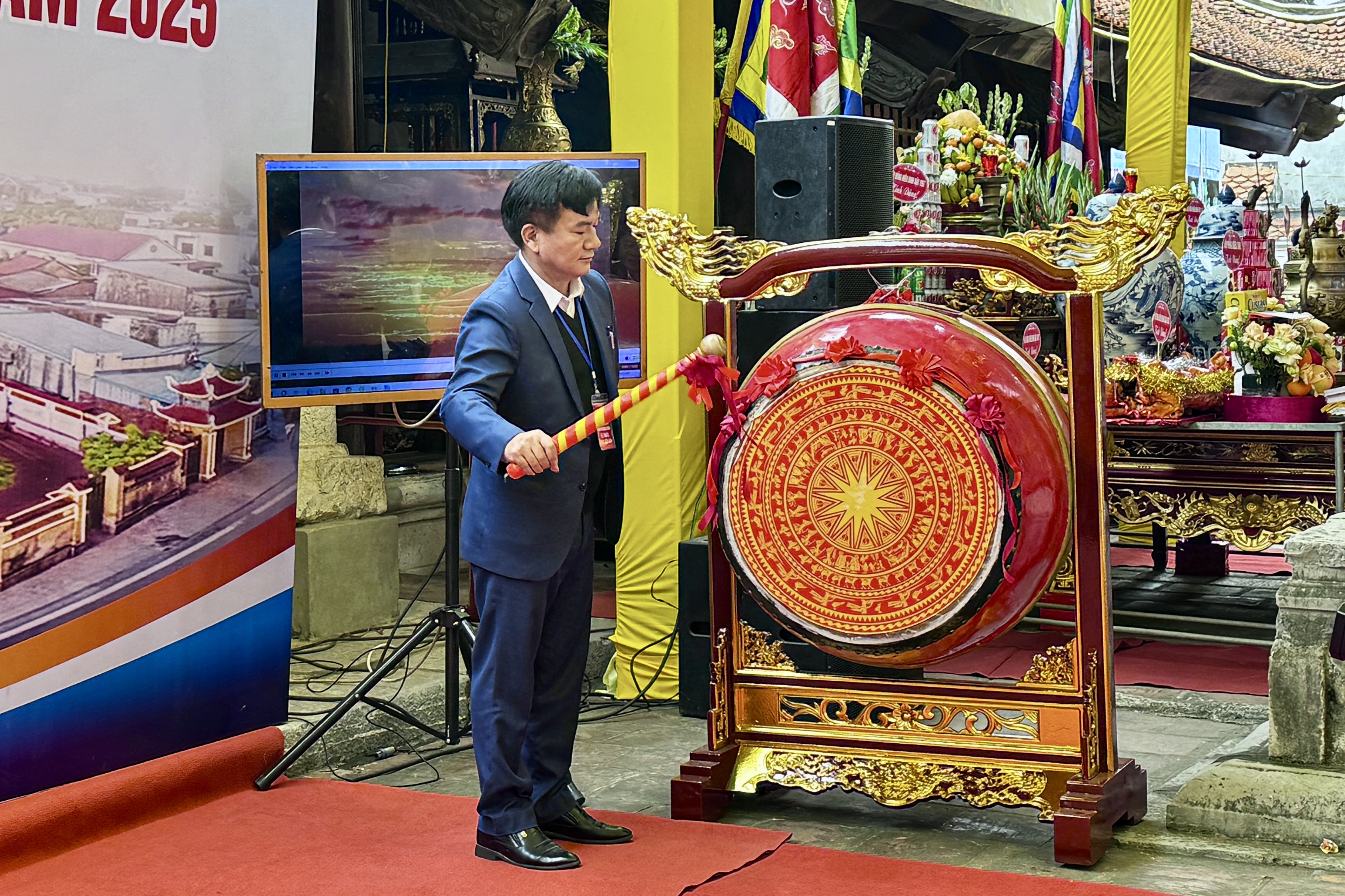 Nghi thức đánh trống khai hội.Sau nghi thức đánh trống khai hội, các đại biểu và Nhân dân đã thực hiện lễ dâng hương và tham gia các nghi thức tế lễ truyền thống như lễ Mộc Dục, đoàn tế Nam quan tuần tế. Các hoạt động này diễn ra trong không khí trang nghiêm, thể hiện đạo lý "uống nước nhớ nguồn" sâu sắc. Nhân dịp này, Ban Tổ chức cũng đã trao quà khuyến học và hỗ trợ cho các hộ gia đình có hoàn cảnh khó khăn, lan tỏa giá trị nhân văn của ngày hội.