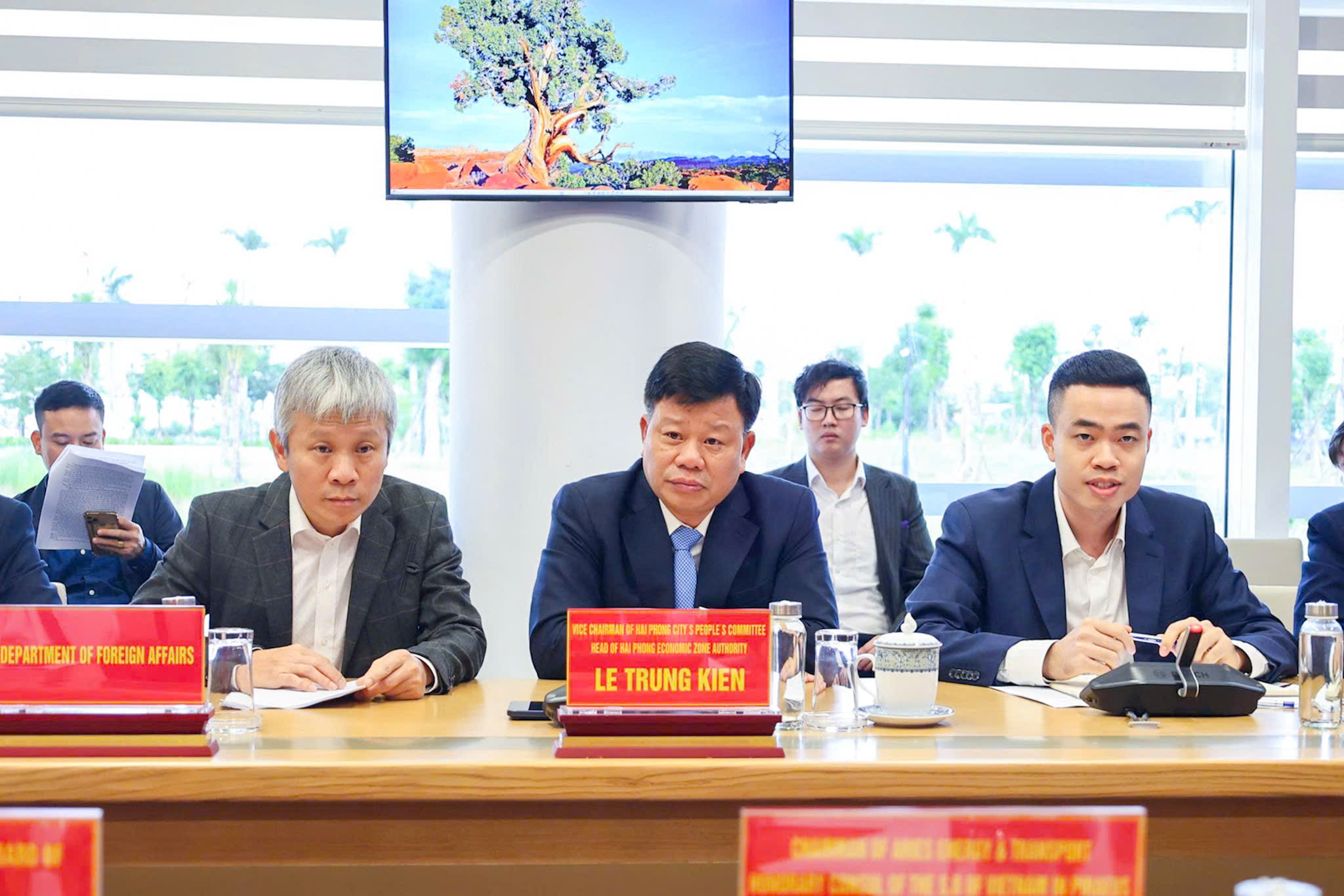 Tại buổi làm việc, đồng chí Phó Chủ tịch UBND thành phố Lê Trung Kiên bày tỏ vui mừng đón tiếp lãnh đạo hai Tập đoàn lớn trong lĩnh vực năng lượng và vận tải biển – lĩnh vực Hải Phòng đặc biệt quan tâm, kêu gọi đầu tư. Đồng chí giới thiệu tới các Tập đoàn những kết quả nổi bật trong phát triển kinh tế - xã hội của Hải Phòng thời gian qua, cùng các tiềm năng, lợi thế của thành phố trên nhiều lĩnh vực. Phó Chủ tịch UBND thành phố cho biết, sau sáp nhập, quy mô kinh tế của thành phố hiện đứng thứ 3 cả nước. Kinh tế của Hải Phòng duy trì mức tăng trưởng 2 con số liên tục trong vòng 10 năm; khẳng định sự phát triển này dựa vào những góp lớn của lĩnh vực công nghiệp, trong đó có ngành công nghiệp vận tải biển và năng lượng. Hải Phòng là thành phố ven biển bờ biển dài với các cảng biển nước sâu cùng hệ thống sông lớn góp phần kết nối giao thông đường thuỷ, đường bộ thuận lợi.