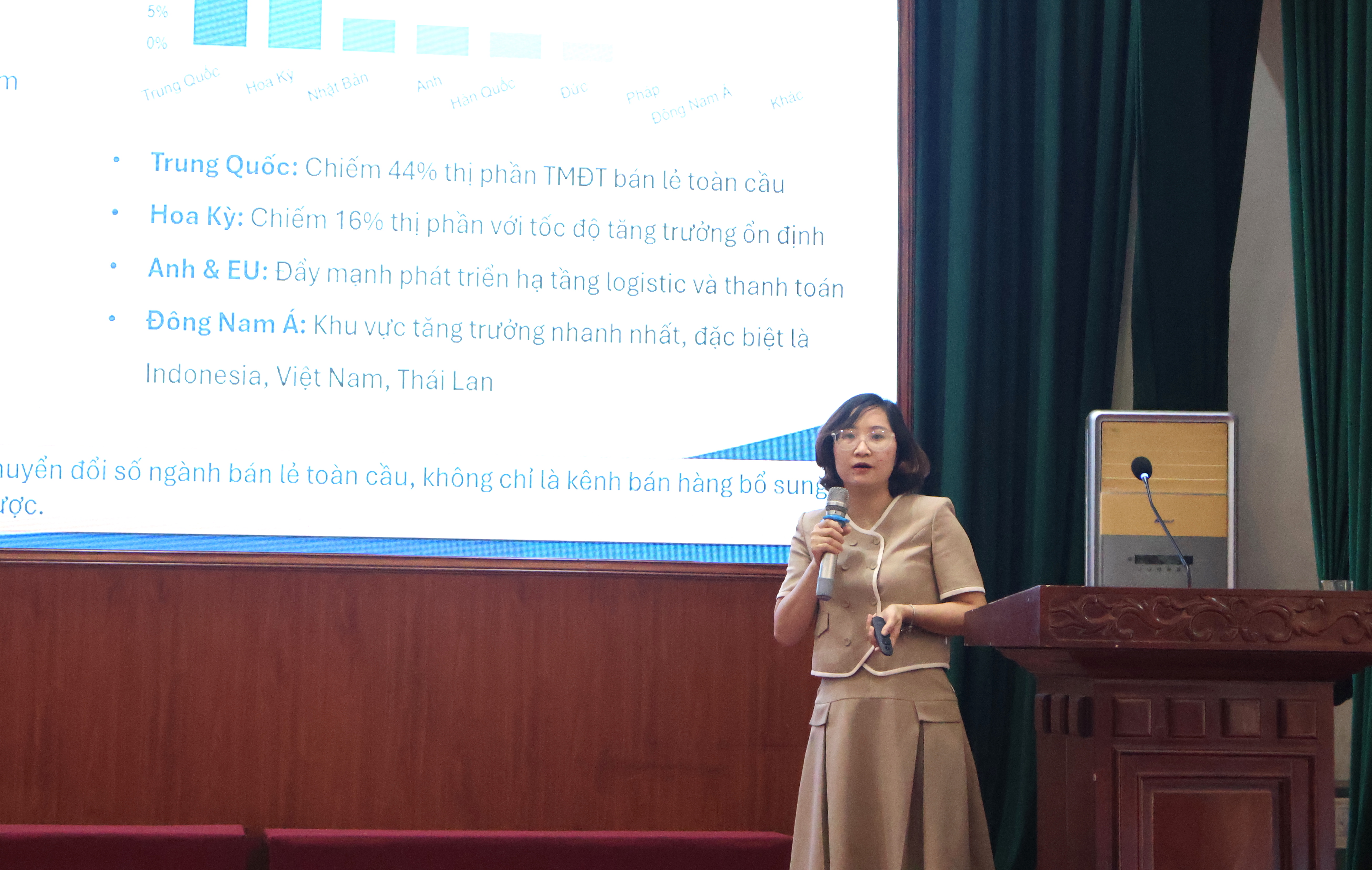 Bà Vũ Thị Kim Phượng, Phó Giám đốc Sở Công Thương phát biểu khai mạc chương trìnhPhát biểu khai mạc, Phó Giám đốc Sở Công Thương Vũ Thị Kim Phượng nhấn mạnh, sự bùng nổ của kinh tế số và chuyển đổi số đang tạo ra bước phát triển mạnh mẽ trong mọi lĩnh vực, đặc biệt là thương mại điện tử (TMĐT). Giai đoạn 2021–2025, TMĐT Việt Nam duy trì tốc độ tăng trưởng 18–25% mỗi năm; riêng năm 2024 dự kiến đạt 27% với quy mô 32 tỷ USD.
