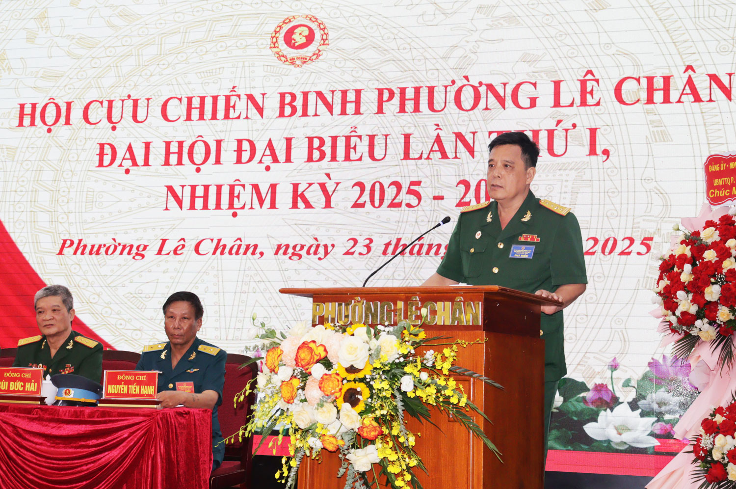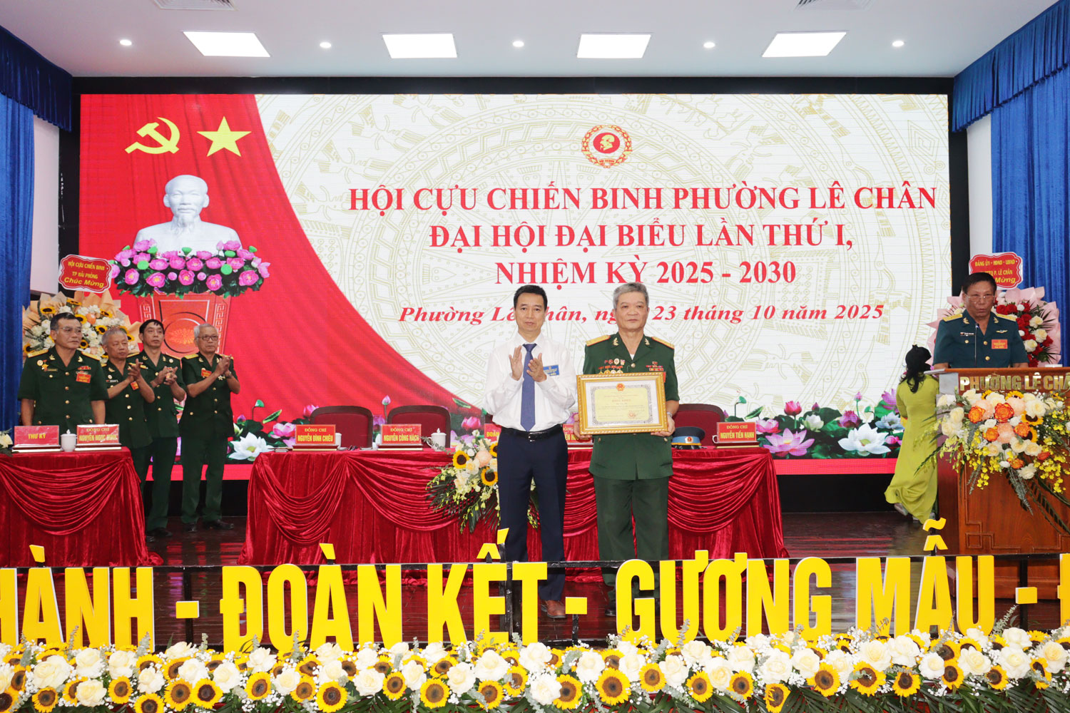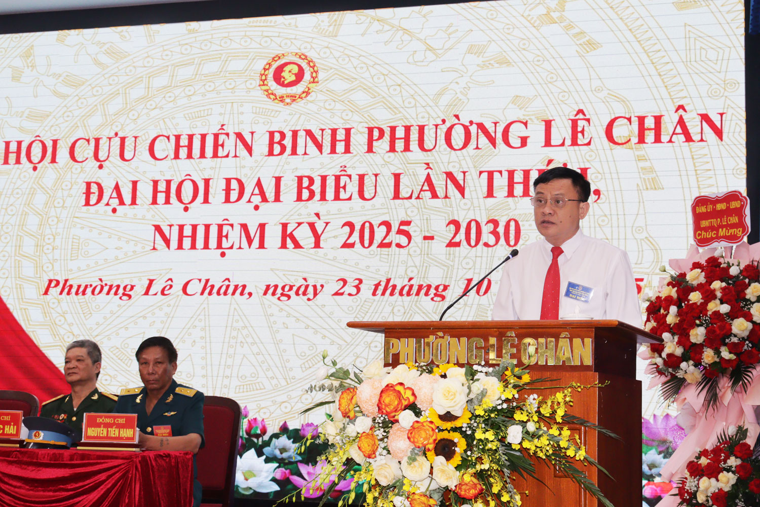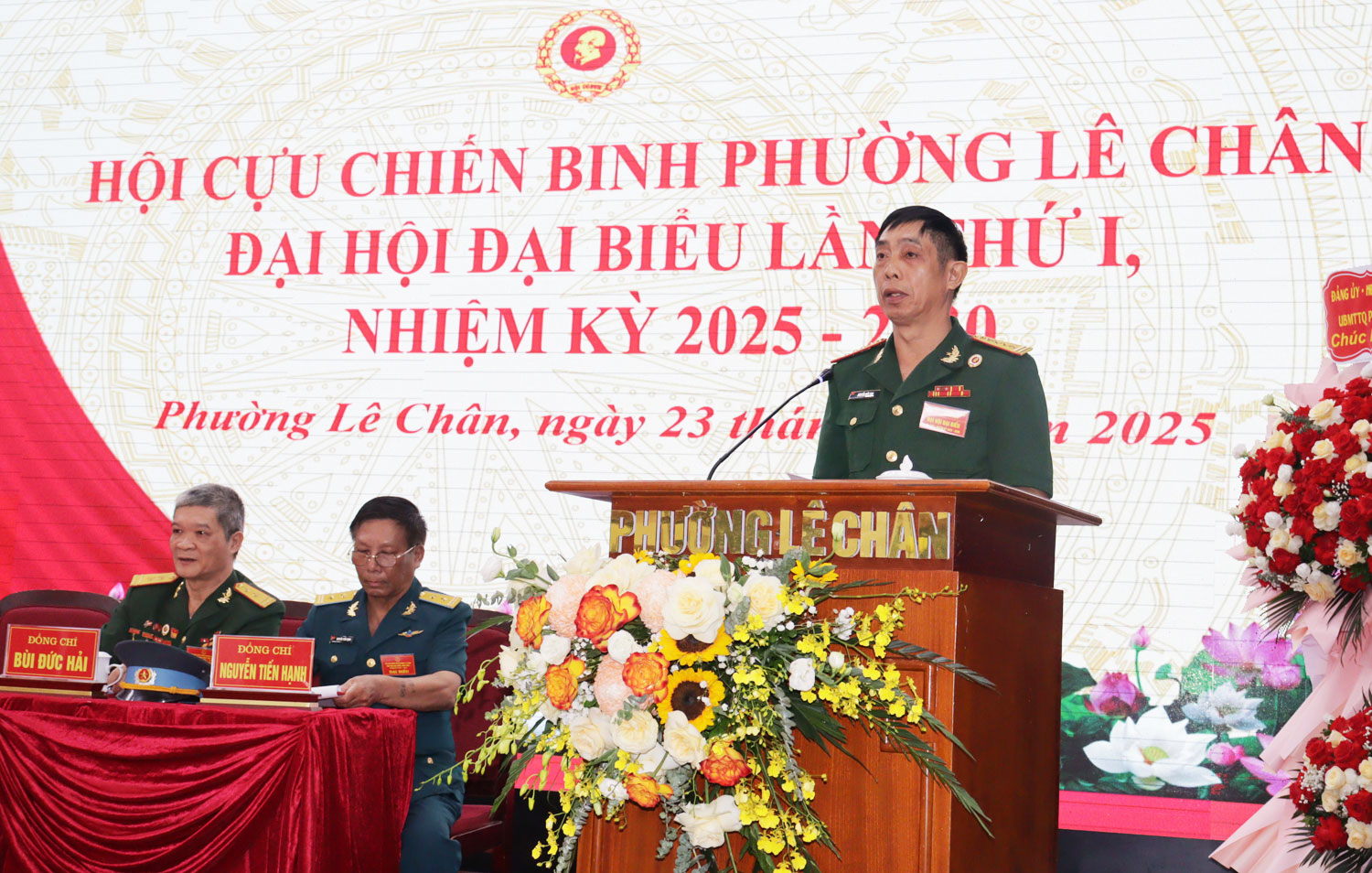 (Haiphong.gov.vn) - Sáng 23/10, Hội Cựu chiến binh phường Lê Chân tổ chức Đại hội đại biểu lần thứ I, nhiệm kỳ 2025 - 2030. Dự Đại hội có các đồng chí: Nguyễn Văn Hùng, Phó Chủ tịch Hội Cựu chiến binh thành phố; Đặng Đông Anh, Ủy viên Thành ủy, Bí thư Đảng ủy, Chủ tịch HĐND phường; Phạm Văn Tân, Phó Bí thư Đảng ủy, Chủ tịch UBND phường; Nguyễn Thị Minh Ngọc, Phó Bí thư Thường trực Đảng ủy phường và 120 đại biểu chính thức, đại diện cho 3.875 hội viên của 96 chi hội trực thuộc.