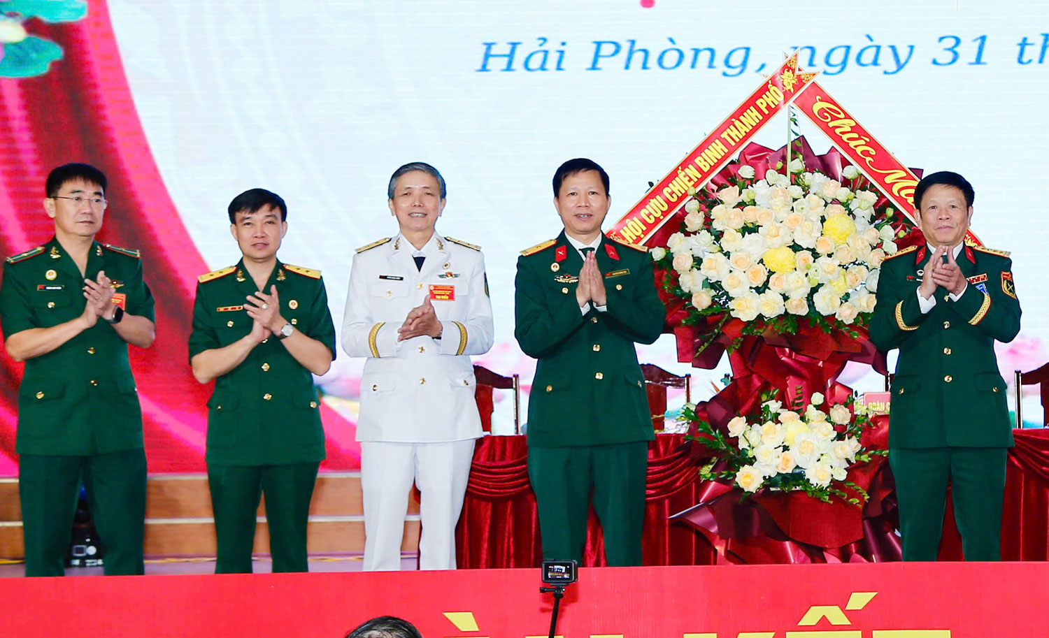 Chủ tịch Hội Cựu chiến binh thành phố tặng hoa chúc mừng Đại hội. Đoàn Chủ tịch và Thư ký tại Đại hội.