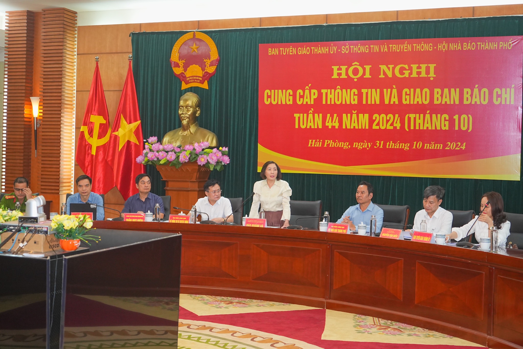 (Haiphong.gov.vn) – Chiều 31/10, Ban Tuyên giáo Thành uỷ, Sở Thông tin và Truyền thông, Hội Nhà báo thành phố phối hợp tổ chức Hội nghị cung cấp thông tin và giao ban báo chí tuần 44 năm 2024. Đồng chí Đào Khánh Hà, Ủy viên Ban thường vụ, Trưởng Ban Tuyên giáo Thành ủy chủ trì Hội nghị.