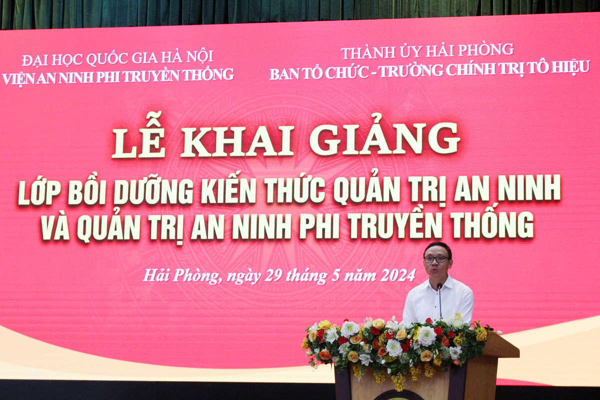 Đồng chí Đào Trọng Đức, Trưởng Ban Tổ chức Thành ủy phát biểu tại Lễ khai giảng.Phát biểu tại Lễ khai giảng, đồng chí Đào Trọng Đức, Trưởng Ban Tổ chức Thành ủy nhấn mạnh, thành phố Hải Phòng luôn nhận thức sâu sắc việc bảo vệ an ninh chính trị là cốt lõi, xuyên suốt. Bên cạnh các vấn đề an ninh truyền thống, thành phố cũng đối diện với những thách thức an ninh phi truyền thống. Việc tổ chức lớp bồi dưỡng nhằm trang bị những thông tin, kiến thức, kỹ năng về quản trị an ninh và quản trị an ninh phi truyền thống cho đội ngũ cán bộ lãnh đạo, quản lý để ứng phó với các tình huống khẩn cấp, nhất là các vấn đề xử lý điểm nóng chính trị, điểm nóng xã hội, phát triển kinh tế và quản trị an ninh kinh tế, quản trị an ninh tài nguyên, môi trường, an ninh biển, an ninh mạng trên địa bàn thành phố.