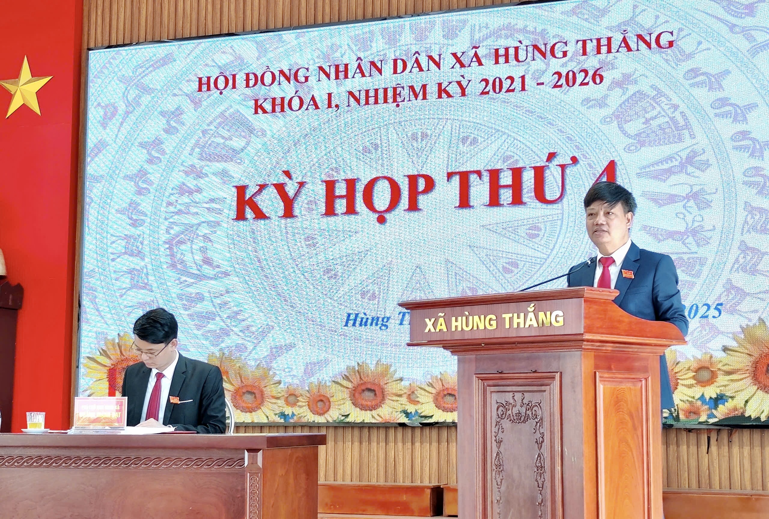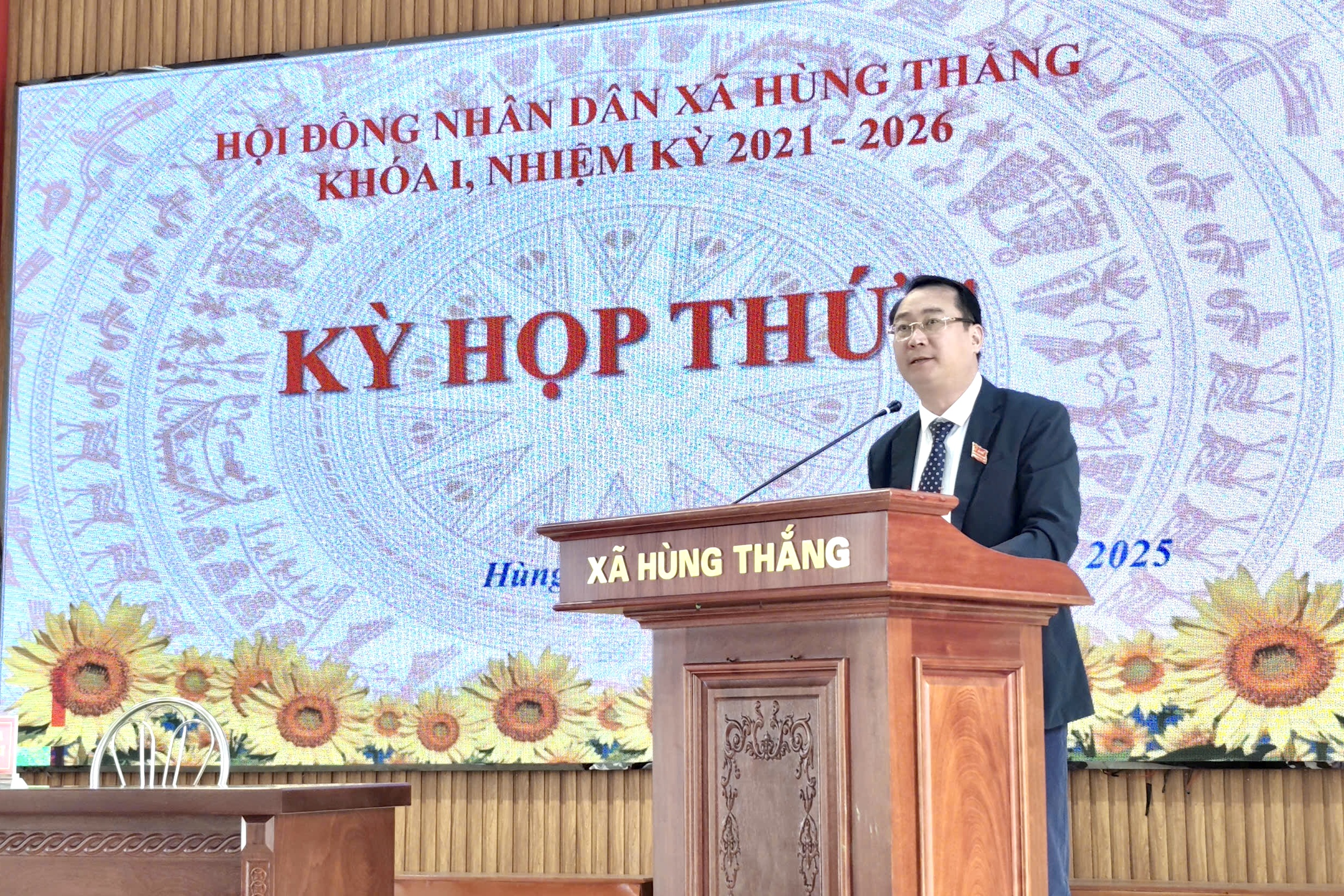 Đồng chis Nguyễn Ngọc Huy, Chủ tịch UBND xã báo cáo tại kỳ họp.Năm 2025, mặc dù còn nhiều khó khăn, song với sự chỉ đạo quyết liệt của cấp ủy, chính quyền và sự đồng thuận của Nhân dân, xã Hùng Thắng cơ bản hoàn thành các chỉ tiêu phát triển kinh tế – xã hội. Tổng giá trị sản xuất trên địa bàn đạt trên 2,5 nghìn tỷ đồng; thu nhập bình quân đầu người đạt 88,5 triệu đồng/năm. Giá trị sản xuất nông, lâm, thủy sản đạt trên 470 tỷ đồng; công nghiệp – tiểu thủ công nghiệp đạt trên 958 tỷ đồng; thương mại – dịch vụ đạt trên 1.161 tỷ đồng. Tổng thu ngân sách đạt trên 172 tỷ đồng, tổng chi trên 166 tỷ đồng. An ninh chính trị, trật tự an toàn xã hội được giữ vững; các lĩnh vực văn hóa, giáo dục, y tế tiếp tục được quan tâm.