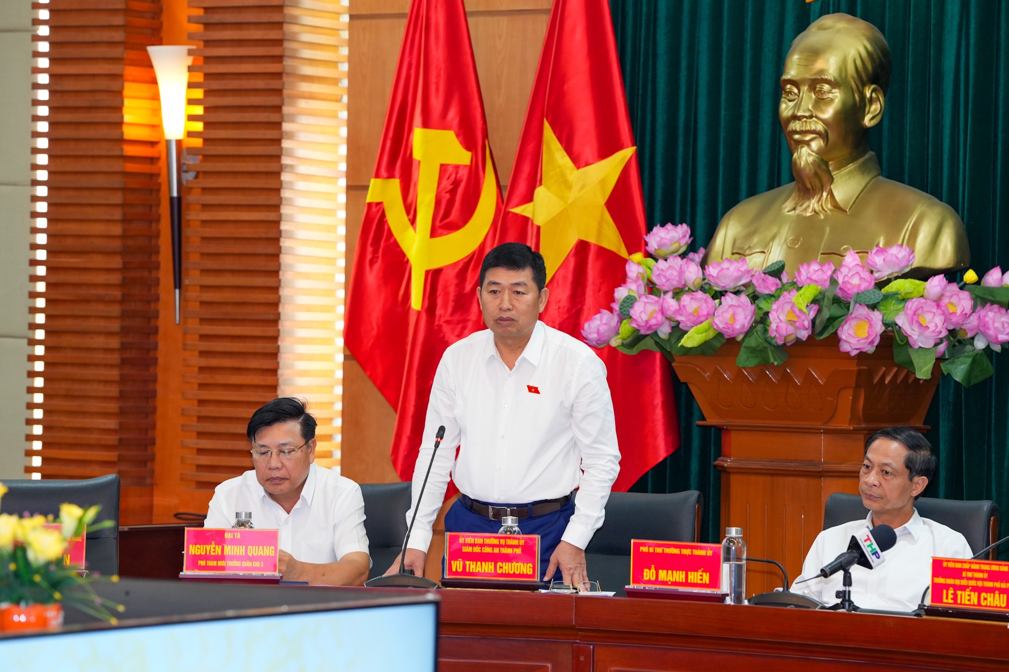 Đồng chí Vũ Thanh Chương, Uỷ viên Ban Thường vụ Thành uỷ, Giám đốc Công an thành phố phát biểu tại Hội nghị.