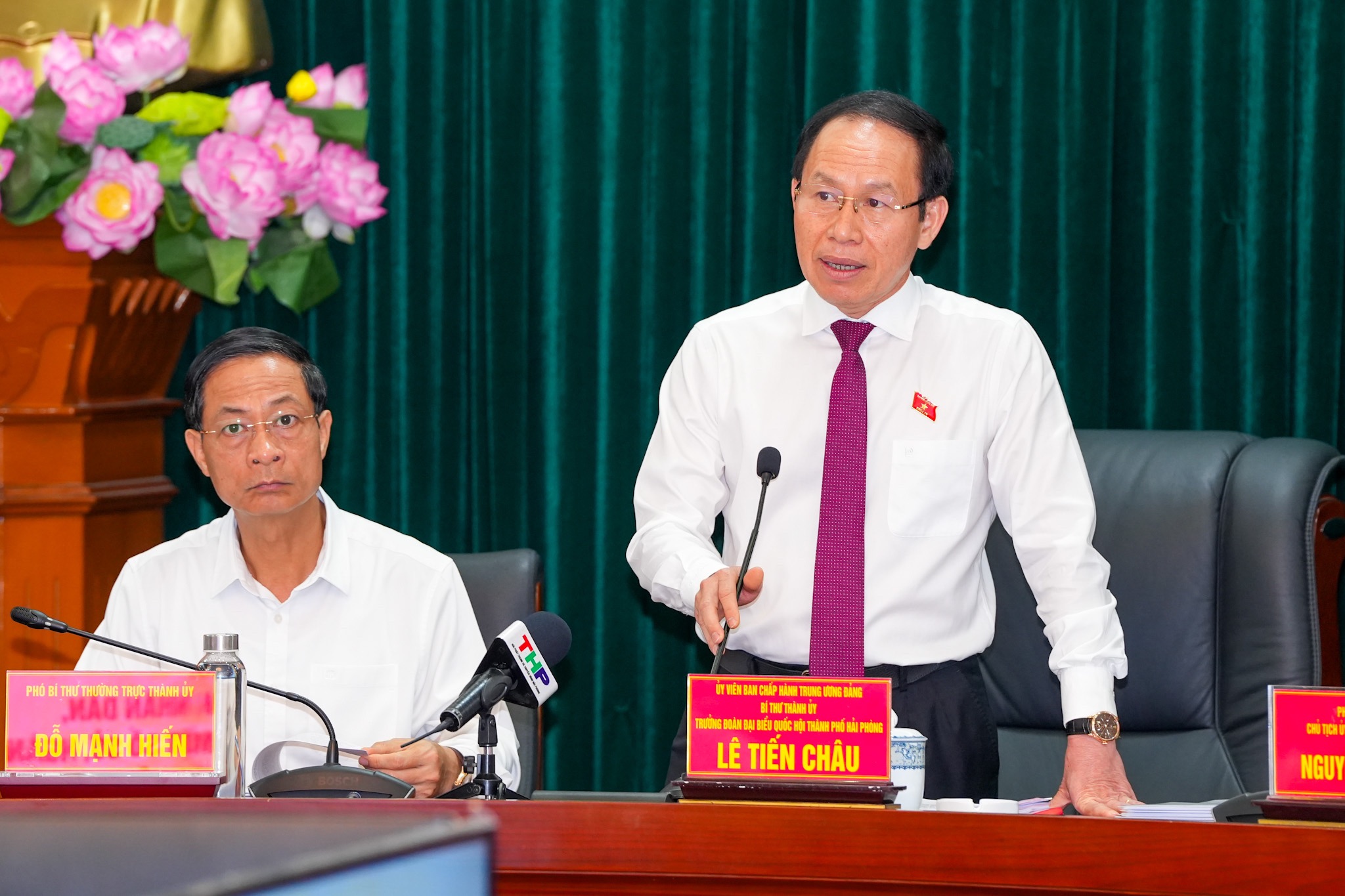 Đồng chí Lê Tiến Châu, Bí thư Thành uỷ, Trưởng Đoàn ĐBQH Hải Phòng tiếp thu các ý kiến, kiến nghị của các cơ quan thành phố.Đồng chí Lê Tiến Châu, Bí thư Thành uỷ, Trưởng Đoàn ĐBQH Hải Phòng đánh giá các ý kiến thẳng thắn, cởi mở, chỉ rõ các điểm nghẽn trong thực hiện và cho biết đây là cơ sở để Đoàn ĐBQH thành phố báo cáo tại Kỳ họp Quốc hội sắp tới. Đồng thời đề nghị các cơ quan tổng hợp ý kiến gửi về văn phòng Đoàn ĐBQH thành phố và phân loại để gửi riêng từng Bộ, ngành. Đối với nội dung ký kết Quy chế phối hợp giữa 4 cơ quan, đồng chí đề nghị bám sát Nghị quyết Đại hội Đảng các cấp; các nhiệm vụ của thành phố, chia sẻ thông tin và ứng dụng CNTT trong thực hiện; cụ thể hoá bằng kế hoạch; định kỳ kiểm điểm, đánh giá rút kinh nghiệm. Đề nghị 4 cơ quan tham mưu để việc thực hiện Quy chế đảm bảo tiến độ, coi đây là thước đo để đánh giá hiệu quả phối hợp; nắm bắt tâm tư, nguyện vọng của người dân; công khai quá trình xử lý kiến nghị, và truyền thông rộng rãi quá trình cũng như kết quả xử lý. Việc Ký kết quy chế phối hợp giữa 4 cơ quan của thành phố được thực hiện làm mẫu để áp dụng tại các quận, huyện.
