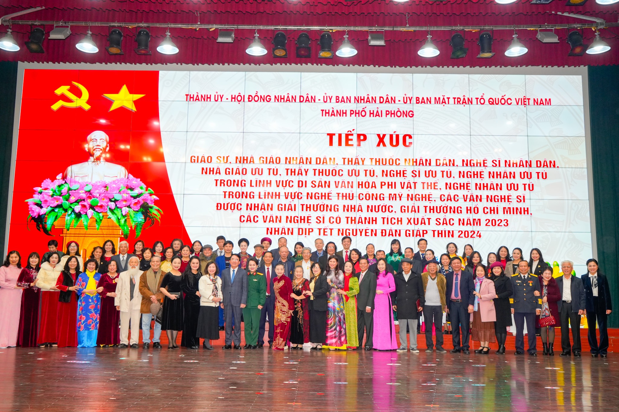 Đại biểu dự chương trình tiếp xúc.Tham dự chương trình có các đồng chí: Nguyễn Văn Tùng, Phó Bí thư Thành ủy, Chủ tịch UBND thành phố; Đỗ Mạnh Hiến, Phó Bí thư Thường trực Thành ủy; Cao Xuân Liên, Ủy viên Ban Thường vụ Thành ủy, Chủ tịch Ủy ban MTTQ Việt Nam thành phố; các đồng chí Ủy viên Ban Thường vụ Thành ủy, Phó Chủ tịch HĐND, UBND, Đoàn Đại biểu Quốc hội thành phố Hải Phòng; đại diện lãnh đạo các Sở, ban, ngành thành phố; cùng hơn 400 đại biểu là Giáo sư, Nhà giáo Nhân dân, Thầy thuốc Nhân dân, Nghệ sĩ Nhân dân, Nhà giáo ưu tú, Thầy thuốc ưu tú, Nghệ sĩ ưu tú, Nghệ nhân ưu tú trong lĩnh vực Di sản văn hóa phi vật thể, Nghệ nhân ưu tú trong lĩnh vực nghề thủ công mỹ nghệ, các văn nghệ sĩ được nhận giải thưởng nhà nước, giải thưởng Hồ Chí Minh, các văn nghệ sĩ có thành tích xuất sắc năm 2023.