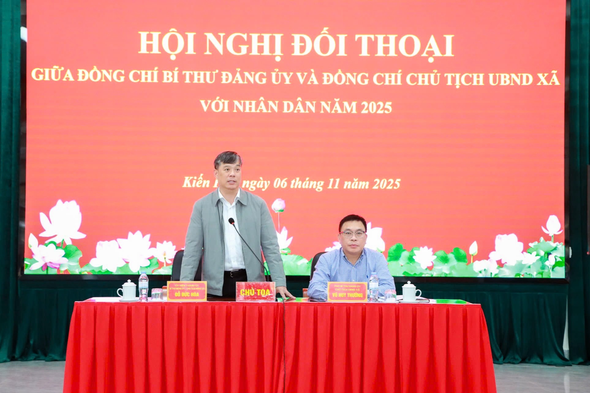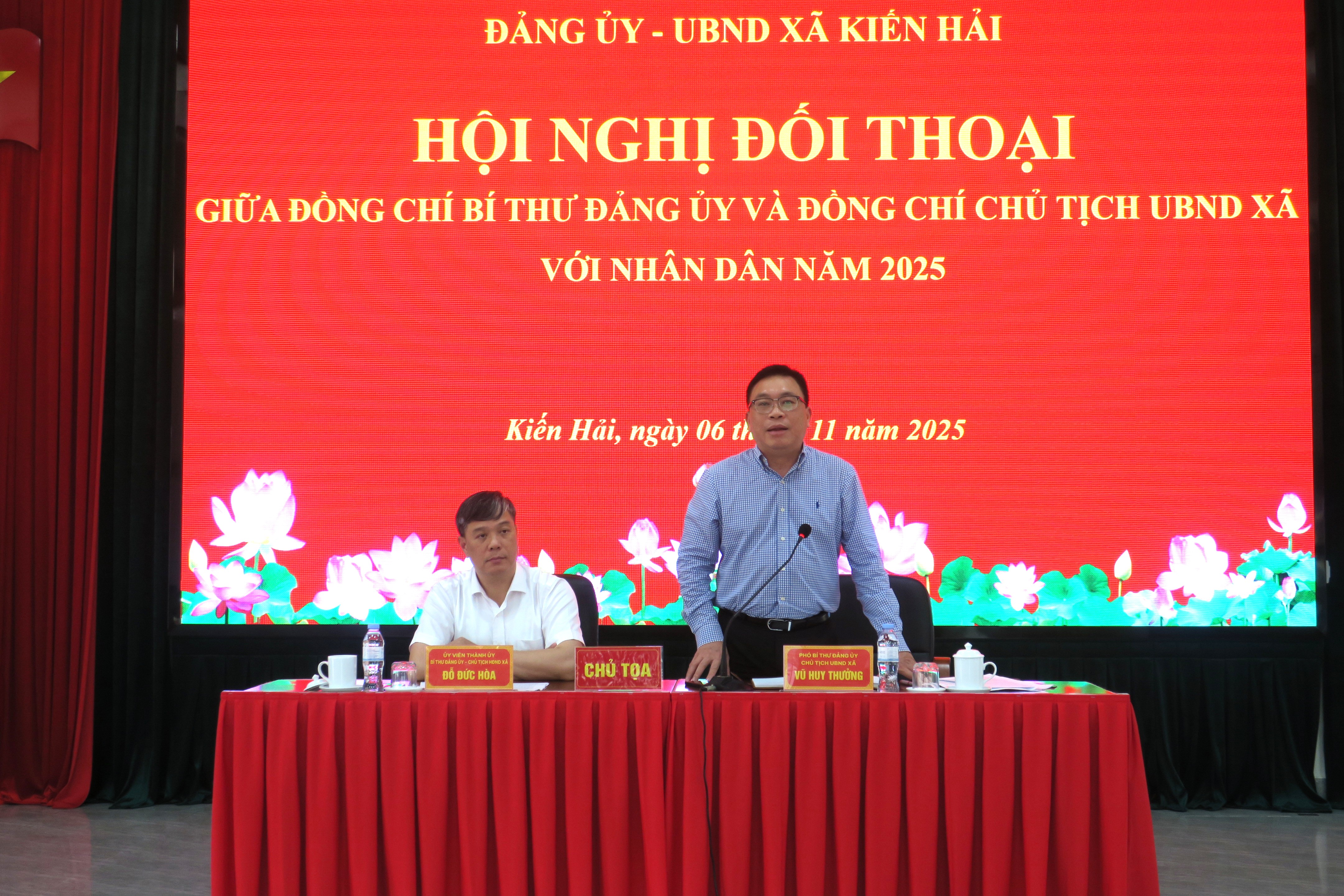 (Haiphong.gov.vn) – Sáng 6/11, Ban Thường vụ Đảng ủy xã Kiến Hải tổ chức Hội nghị đối thoại giữa người đứng đầu cấp ủy, chính quyền với Nhân dân trên địa bàn xã. Các đồng chí Đỗ Đức Hòa – Bí thư Đảng ủy, Chủ tịch HĐND xã; Vũ Huy Thưởng – Chủ tịch UBND xã Kiến Hải chủ trì Hội nghị.