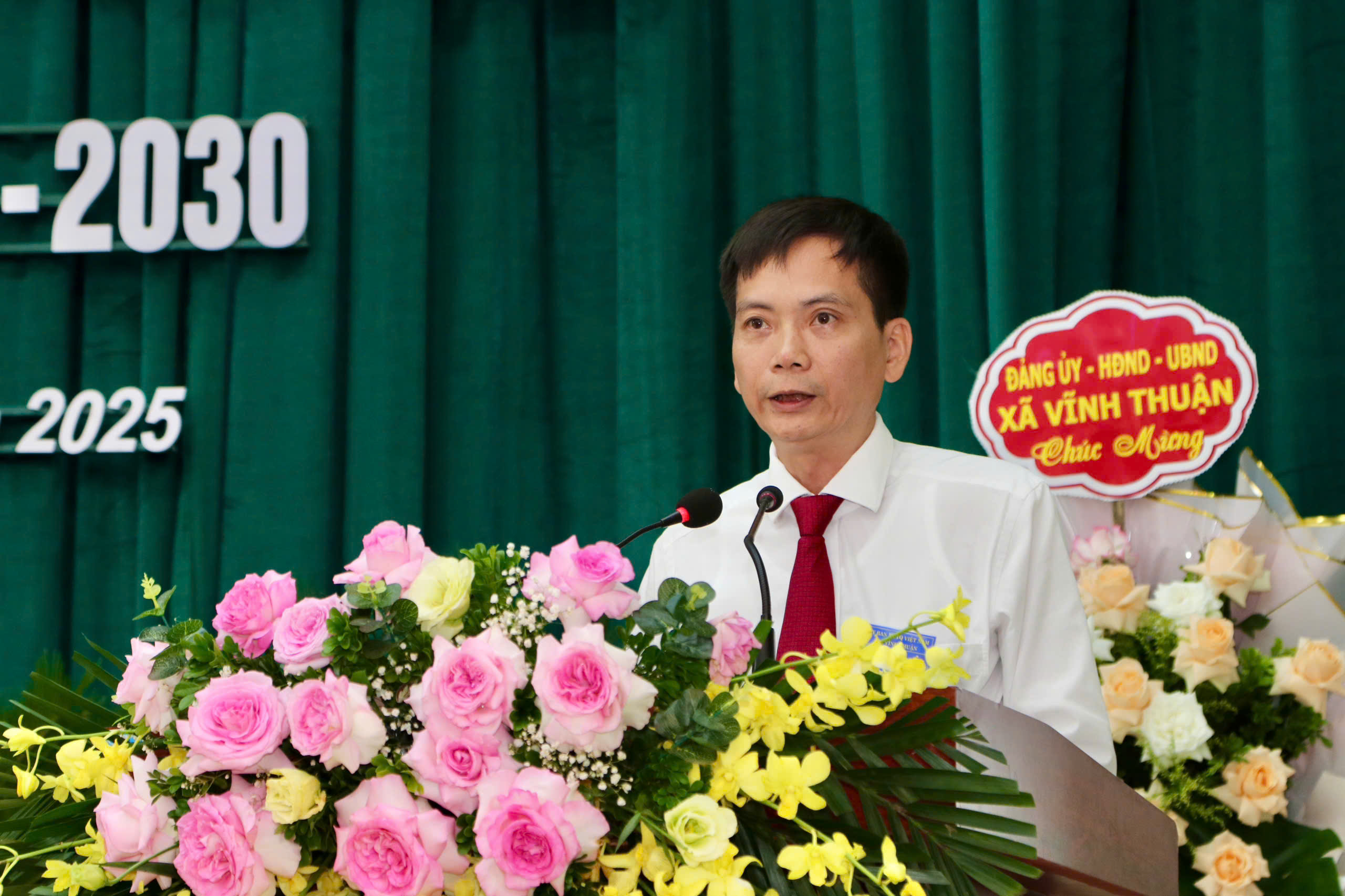 Đồng chí Trần Thanh Minh, Bí thư Đảng ủy xã phát biểu chỉ đạo Đại hộiPhát biểu chỉ đạo đại hội, đồng chí Trần Thanh Minh, Bí thư Đảng ủy, Chủ tịch HĐND xã Vĩnh Thuận, đề nghị MTTQ Việt Nam xã tập trung thực hiện ba nhiệm vụ trọng tâm: Gắn công tác Mặt trận với nhiệm vụ xây dựng Đảng, xây dựng hệ thống chính trị trong sạch, vững mạnh, hiệu lực, hiệu quả. Đổi mới nội dung, phương thức hoạt động của Mặt trận trong bối cảnh chính quyền hai cấp và chuyển đổi số, bảo đảm gần dân, sát dân hơn nữa. Phát huy vai trò cầu nối, góp phần củng cố sự đồng thuận xã hội, giữ vững ổn định chính trị, trật tự an toàn xã hội, tạo môi trường thuận lợi để xã Vĩnh Thuận phát triển nhanh, bền vững.