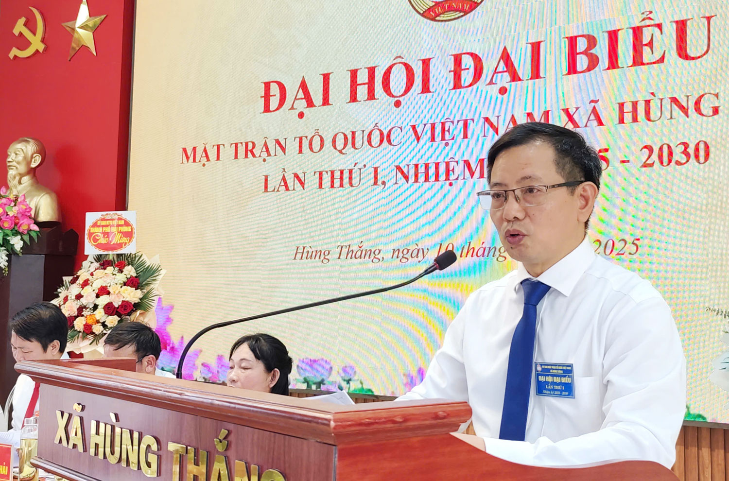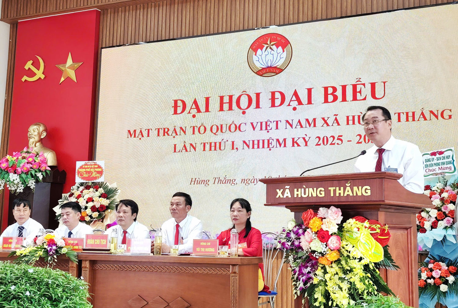 Đồng chí Đặng Văn Hách, Phó Chủ tịch Ủy ban MTTQ Việt Nam thành phố phát biểu chỉ đạo tại Đại hội.Phát biểu chỉ đạo tại Đại hội, đồng chí Đặng Văn Hách, Phó Chủ tịch Ủy ban MTTQ Việt Nam thành phố và đồng chí Đỗ Mạnh Hiếu, Bí thư Đảng ủy, Chủ tịch HĐND xã ghi nhận, biểu dương những kết quả nổi bật mà MTTQ xã Hùng Thắng đạt được trong nhiệm kỳ qua và khẳng định: trong bối cảnh xã Hùng Thắng vừa được sáp nhập, quy mô lớn, dân số đông, địa bàn rộng, MTTQ cần tiếp tục phát huy vai trò trung tâm trong khối đại đoàn kết toàn dân; chủ động nắm bắt tâm tư, nguyện vọng của Nhân dân, làm tốt công tác tham mưu với cấp ủy, phối hợp với chính quyền trong việc triển khai các nhiệm vụ chính trị, phát triển kinh tế - xã hội của địa phương.