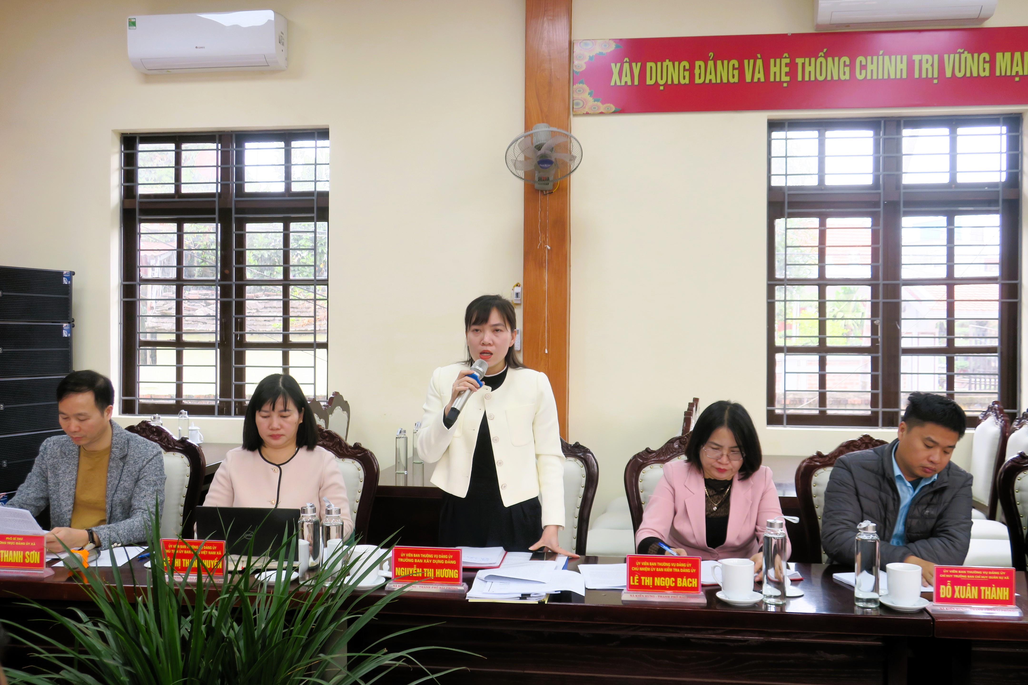 Đồng chí Nguyễn Thị Hương, Trưởng Ban Xây dựng Đảng phát biểu ý kiến.Bên cạnh đó, xã chỉ đạo quyết liệt, đồng bộ công tác giải phóng mặt bằng, phối hợp tổ chức thành công Lễ khởi công Dự án đầu tư phát triển kết cấu hạ tầng Khu Công nghiệp Tân Trào (giai đoạn 1) và Dự án Nhà máy Nhiệt điện LNG Hải Phòng. Công tác quản lý nhà nước trên các lĩnh vực được tăng cường; trọng tâm là cải cách hành chính, nâng cao hiệu quả phục vụ người dân và doanh nghiệp. Trung tâm Phục vụ Hành chính công của xã hoạt động ngày càng hiệu lực, hiệu quả, bảo đảm giải quyết hồ sơ đúng quy trình, đúng thời hạn.