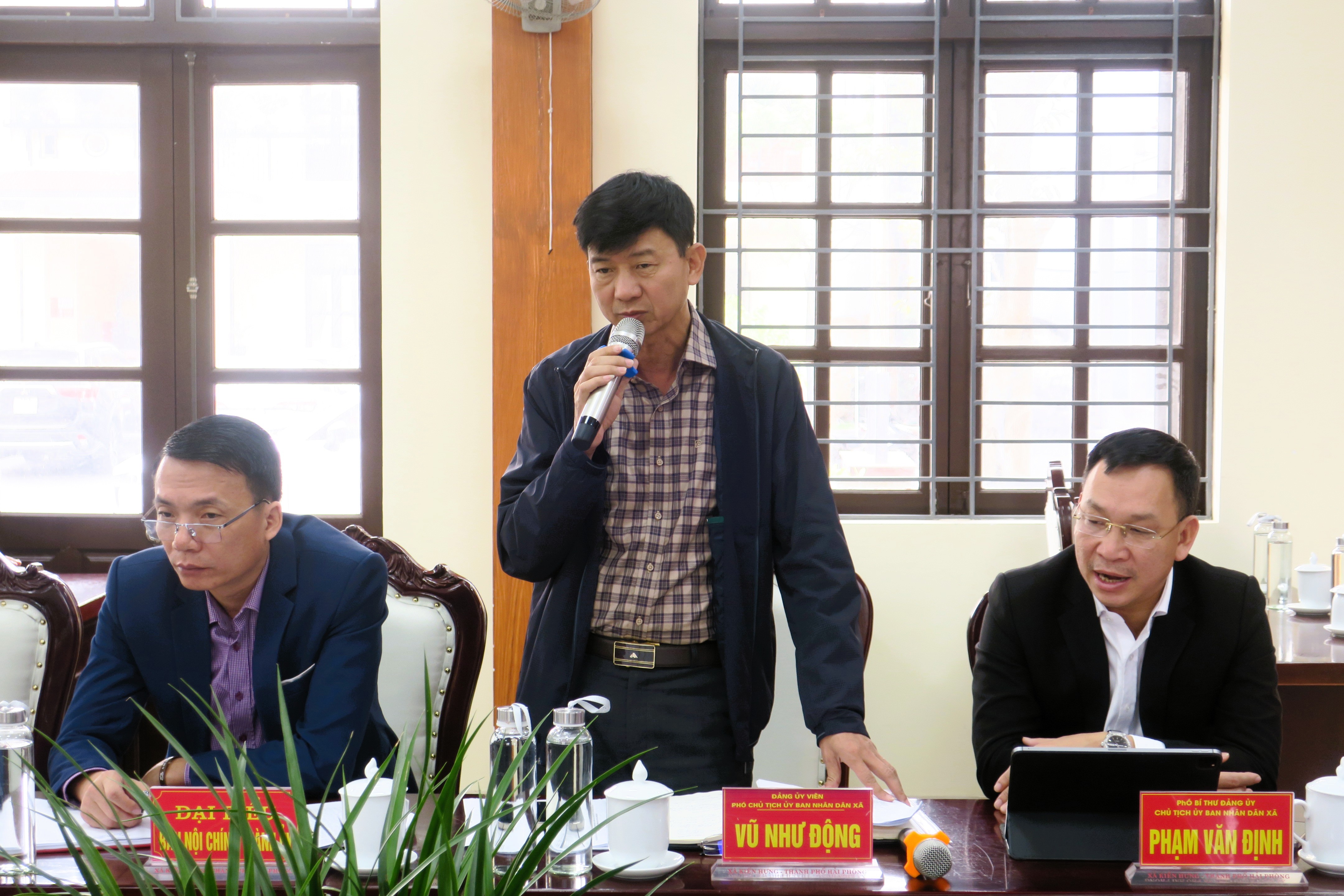 Đồng chí Vũ Như Động, Phó Chủ tịch UBND xã phát biểu ý kiến.Tính đến thời điểm này, xã hoàn thành và hoàn thành vượt mức 15/18 chỉ tiêu, 2/18 chỉ tiêu đang thực hiện đảm bảo tiến độ, còn chỉ tiêu về tỷ lệ gia tăng dân số tự nhiên chưa đạt. Trong đó, thu ngân sách năm 2025 đạt 3.603/2.387 triệu đồng, đạt 151% so với dự toán được giao. Chi ngân sách cả năm đạt 139.870 triệu đồng, đạt 100% kế hoạch. Diện tích gieo cấy cả năm đạt 1.753,69 ha, đạt 101,9% kế hoạch. Tổng đàn trâu bò 211 con, đạt 180,34% kế hoạch; đàn lợn 9.463 con, đạt 147,62% kế hoạch; đàn gia cầm, thủy cầm 183.210 con, đạt 159,45% kế hoạch. Diện tích nuôi trồng thủy sản đạt 265,5 ha.