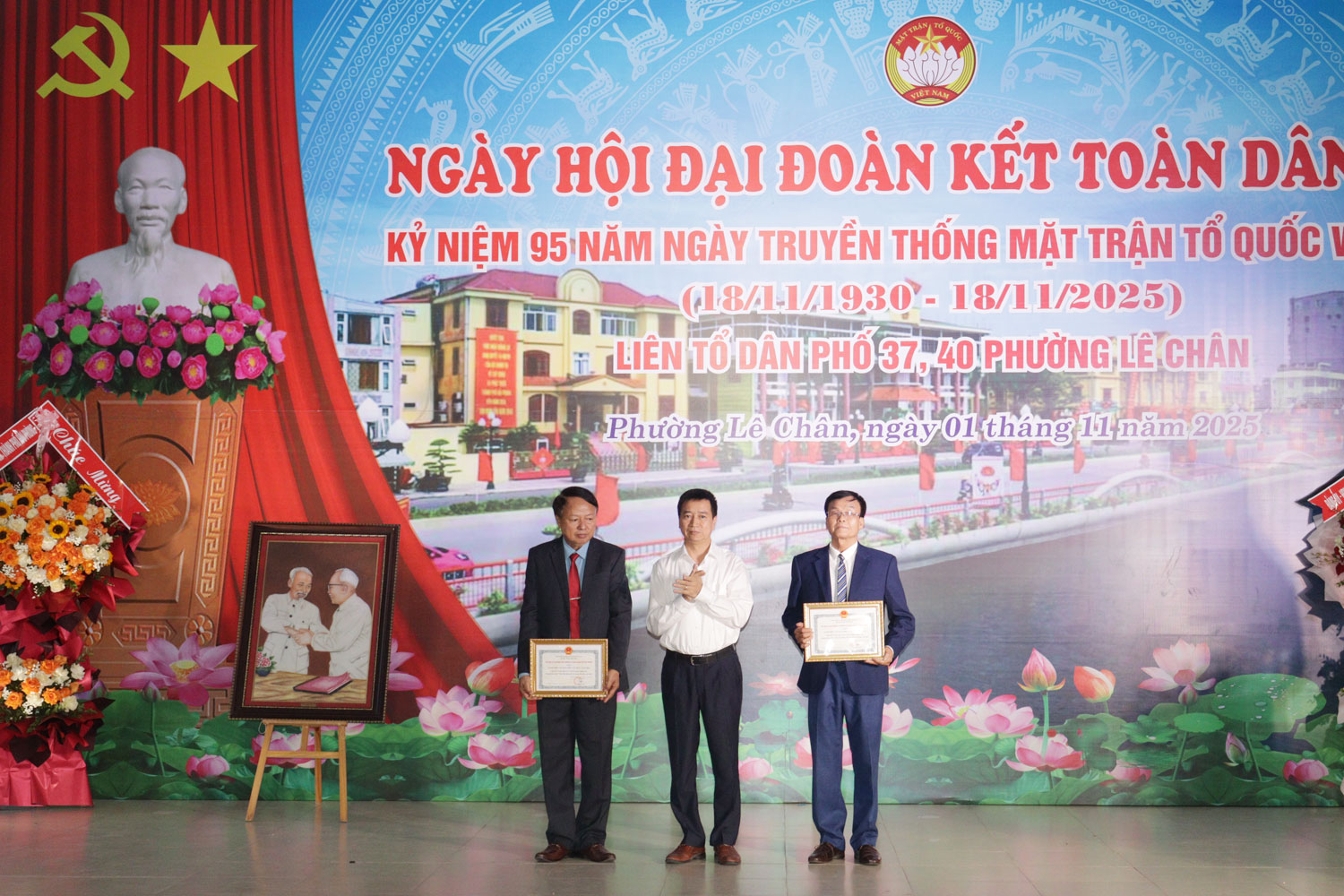 Lãnh đạo phường Lê Chân tặng danh hiệu “Tổ dân phố văn hóa” năm 2025 cho nhân dân và cán bộ Tổ dân phố số 37 và 40.Nhân dịp này, Ủy ban MTTQ Việt Nam thành phố đã tặng Bằng khen cho Ban Công tác Mặt trận Tổ dân phố số 37 và 40 đã có thành tích trong phong trào “Toàn dân đoàn kết xây dựng đời sống văn hóa” năm 2025; UBND phường Lê Chân tặng danh hiệu “Tổ dân phố văn hóa” năm 2025 cho nhân dân và cán bộ Tổ dân phố số 37 và 40./.