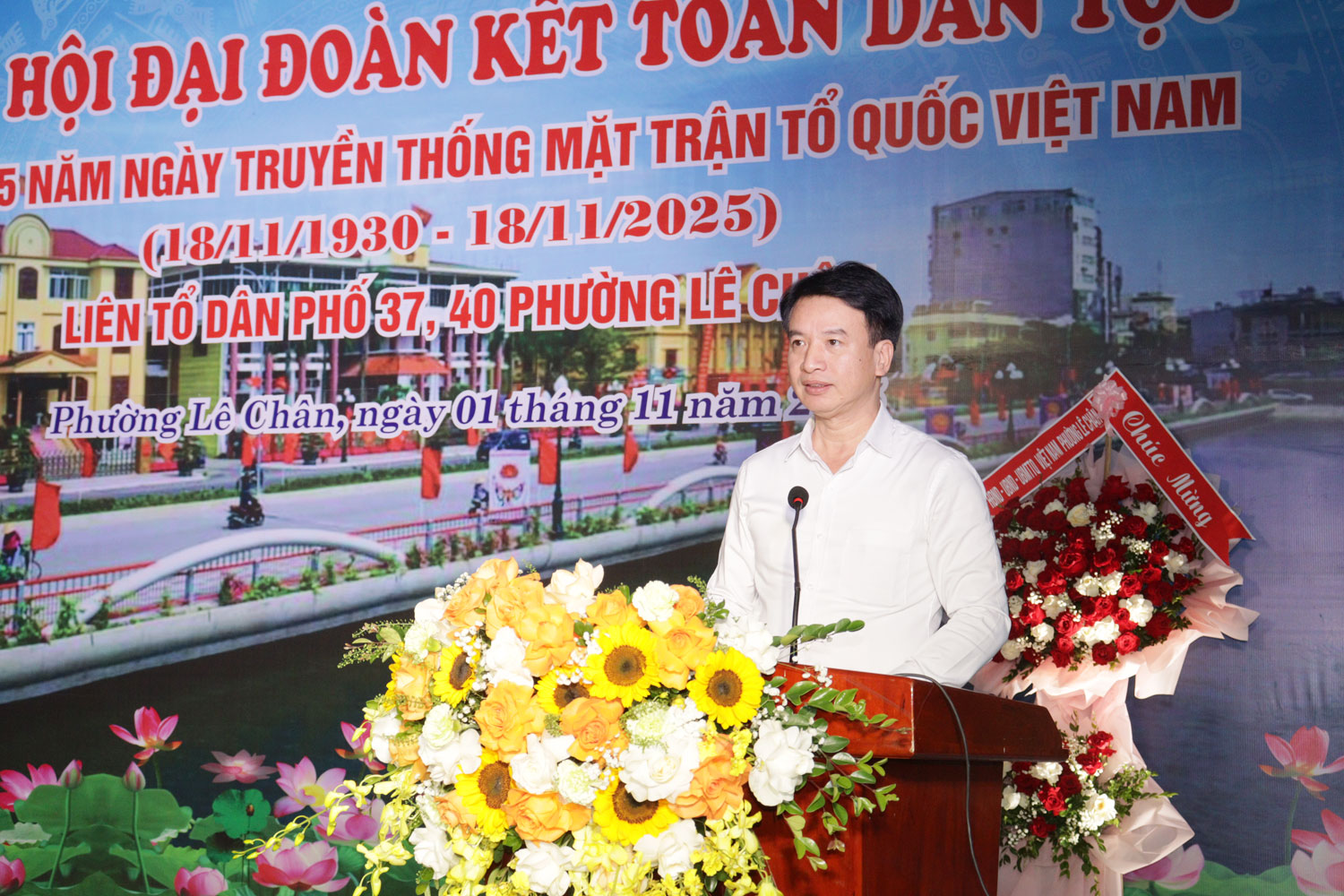 Đồng chí Nguyễn Đức Tuấn, Phó Chủ tịch Thường trực Ủy ban MTTQ Việt Nam thành phố phát biểu tại Ngày hội.Phát biểu tại Ngày hội, đồng chí Nguyễn Đức Tuấn, Phó Chủ tịch Thường trực Ủy ban MTTQ Việt Nam thành phố chúc mừng những kết quả, thành tích liên Tổ dân phố số 37 và 40 đã đạt được trong thời gian qua, tinh thần “Tương thân tương ái”, “Đền ơn đáp nghĩa” được Tổ dân phố phát huy mạnh mẽ, tích cực thăm hỏi và tặng quà các gia đình chính sách nhân dịp lễ, Tết và kỷ niệm ngày Thương binh liệt sỹ 27/7; thăm, tặng quà các hộ dân có hoàn cảnh khó khăn. Những thành tích nêu trên là minh chứng rõ nét cho sức mạnh của khối đại đoàn kết toàn dân của liên Tổ dân phố.
