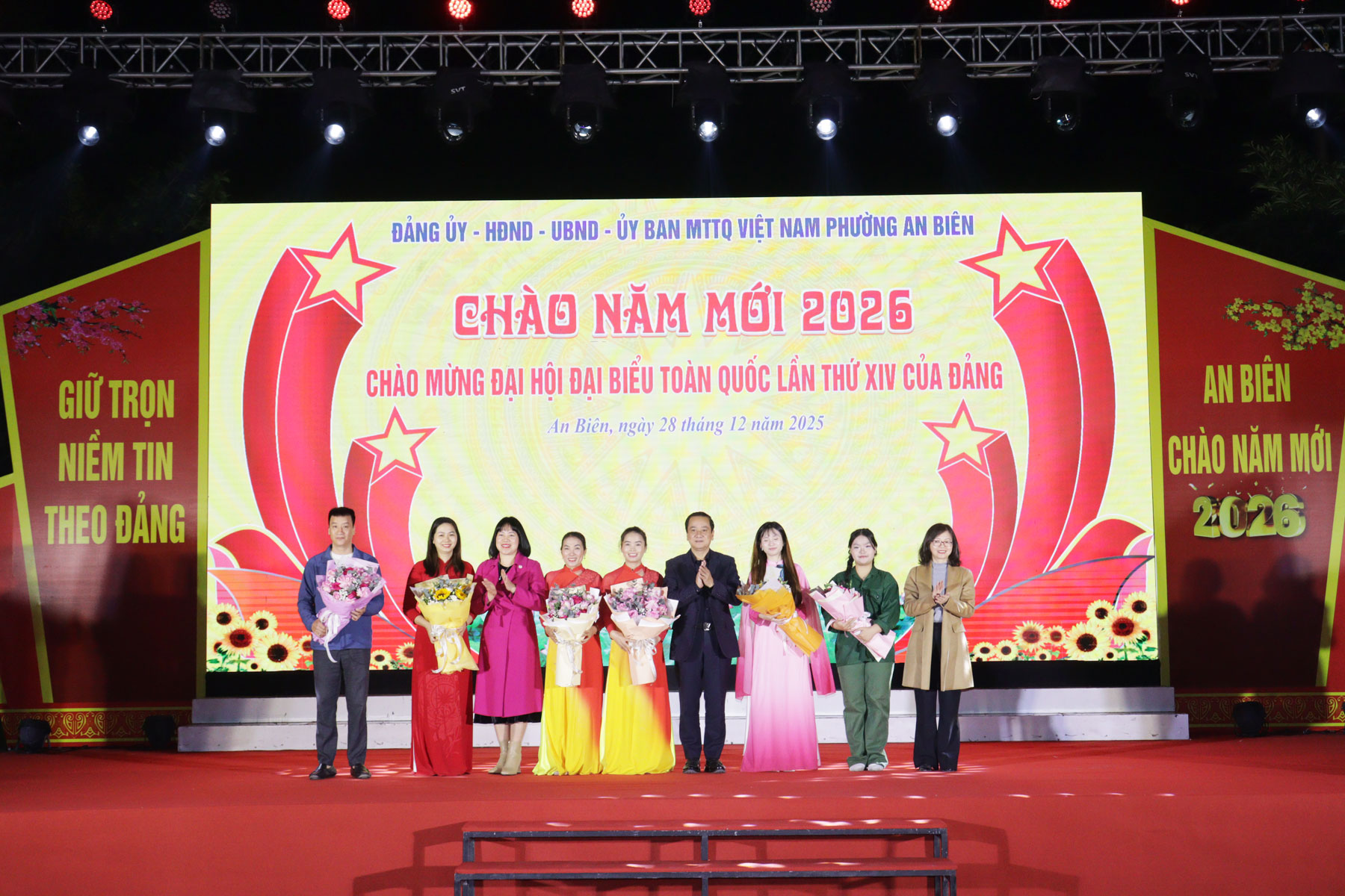 Lãnh đạo phường An Biên tặng hoa cho các đơn vị tham gia chương trình.Chương trình là hoạt động văn hóa trọng điểm nhằm tạo không khí vui tươi, phấn khởi trong quần chúng nhân dân trước thềm năm mới, đồng thời thể hiện niềm tin, sự kỳ vọng của Đảng bộ và nhân dân phường hướng về sự kiện chính trị trọng đại của đất nước - Đại hội Đảng toàn quốc lần thứ XIV.