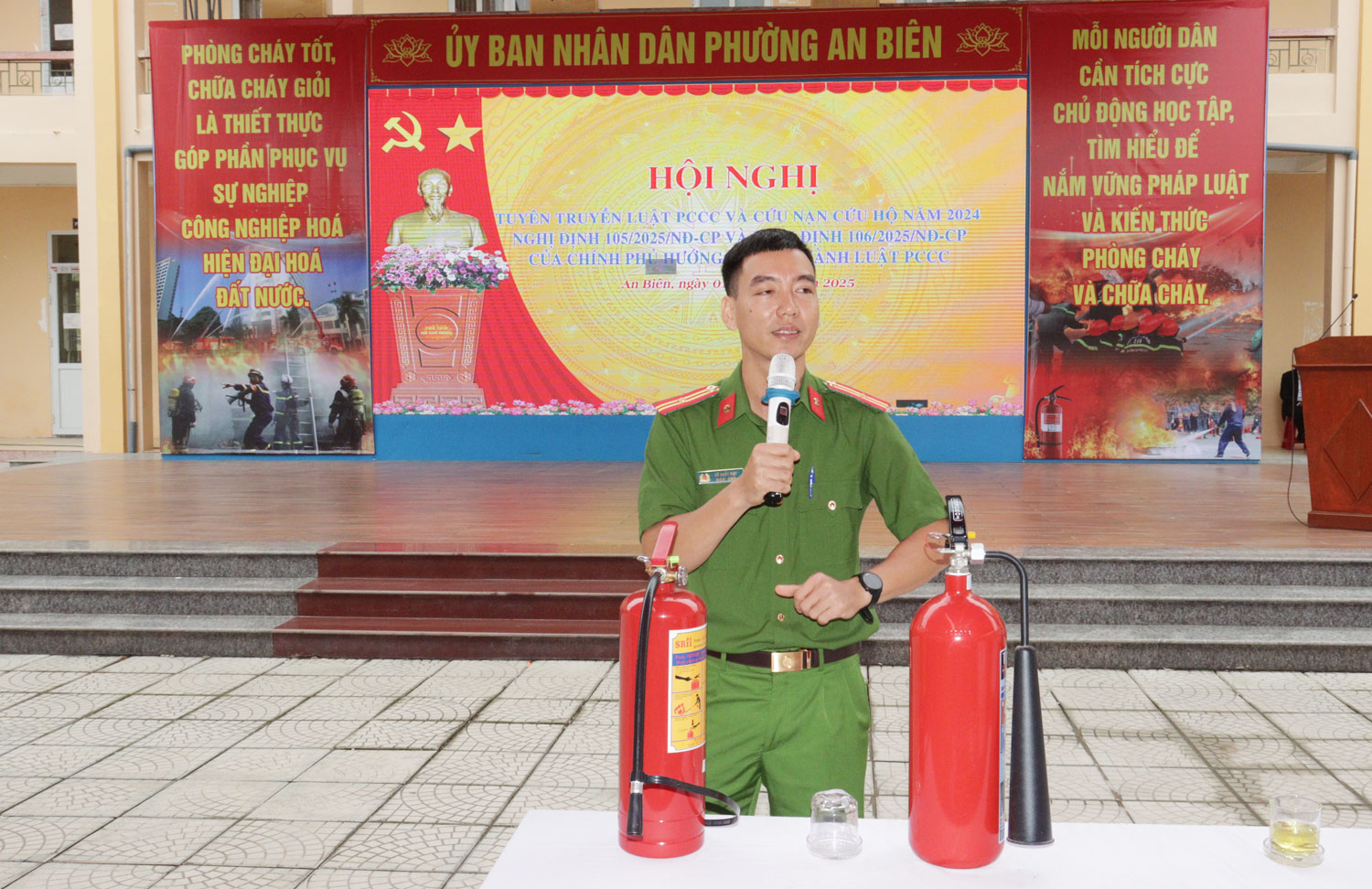 Thực hành thao tác sử dụng bình chữa cháy để rèn luyện kỹ năng ứng phó nhanh, hiệu quả khi xảy ra sự cố.Thời gian qua, phường An Biên luôn xác định công tác tuyên truyền và thực hành PCCC và CNCH là nhiệm vụ quan trọng, cần được duy trì thường xuyên. Mỗi người dân phải nắm vững kiến thức cơ bản, biết cách phòng ngừa, phát hiện và xử lý ban đầu để bảo vệ an toàn tính mạng và tài sản của chính mình và cộng đồng.
