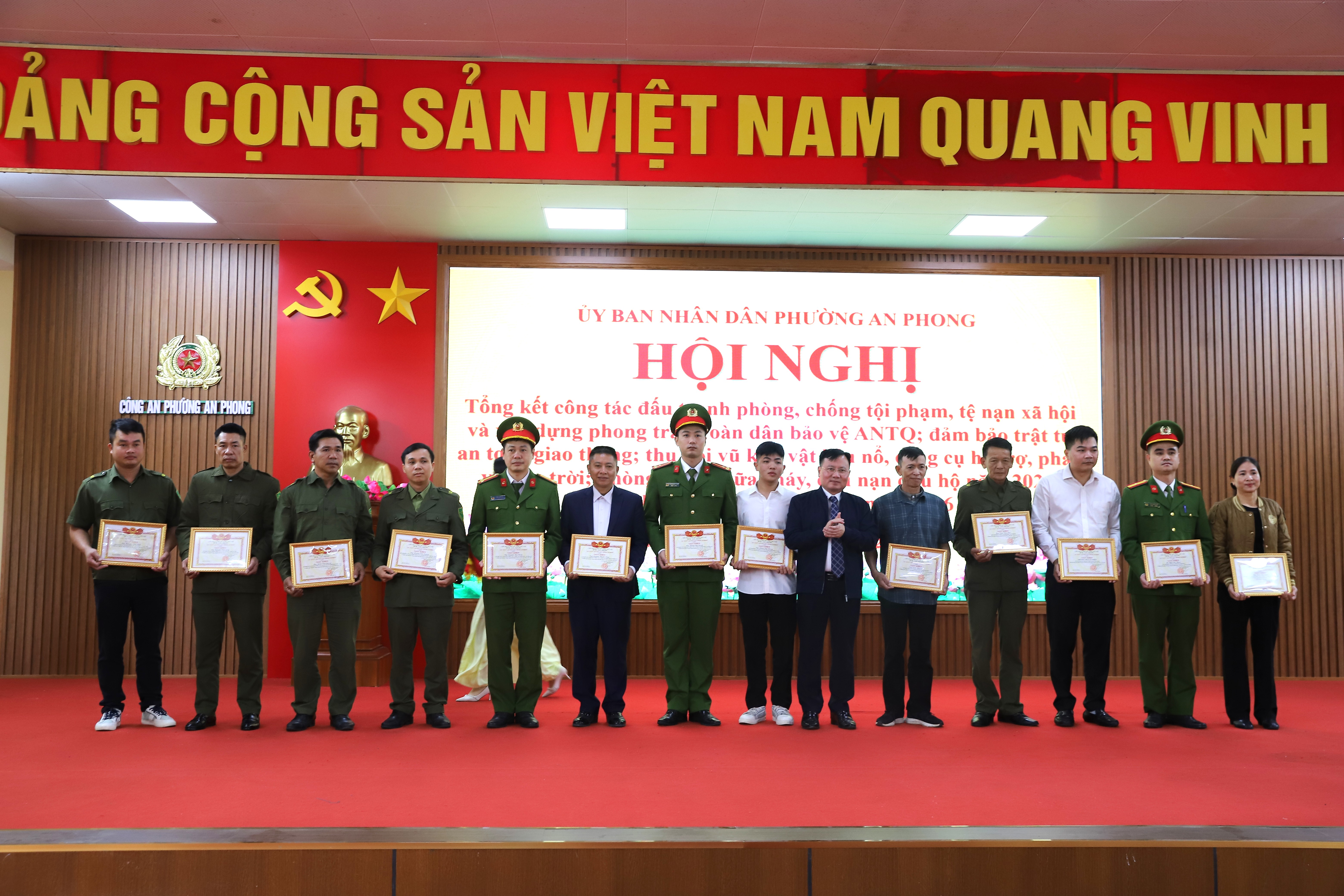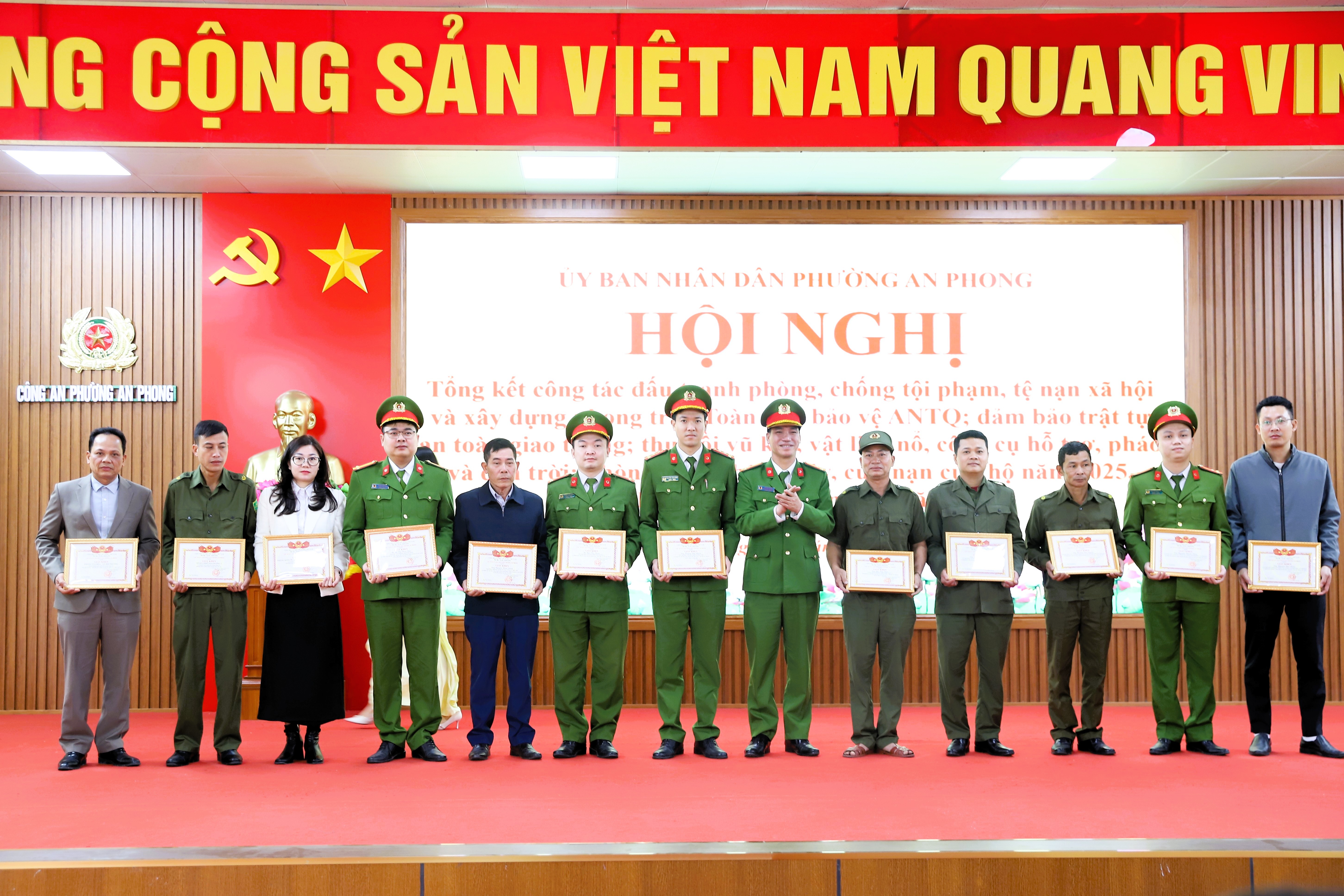 Nhân dịp Hội nghị, UBND phường An Phong tặng Giấy khen cho 9 tập thể, 15 cá nhân có thành tích xuất sắc trong công tác phòng, chống tội phạm, tệ nạn xã hội và xây dựng phong trào toàn dân bảo vệ an ninh tổ quốc năm 2025; 01 tập thể và 3 cá nhân có thành tích xuất sắc trong công tác thu hồi Vũ khí – Vật liệu nổ - Công cụ hỗ trợ, pháo và “đèn trời” năm 2025; 01 tập thể và 7 cá nhân có thành tích xuất sắc trong công tác phòng cháy, chữa cháy và cứu nạn cứu hộ năm 2025; 2 tập thể và 6 cá nhân có thành tích xuất sắc trong công tác bảo đảm trật tự an toàn giao thông năm 2025.