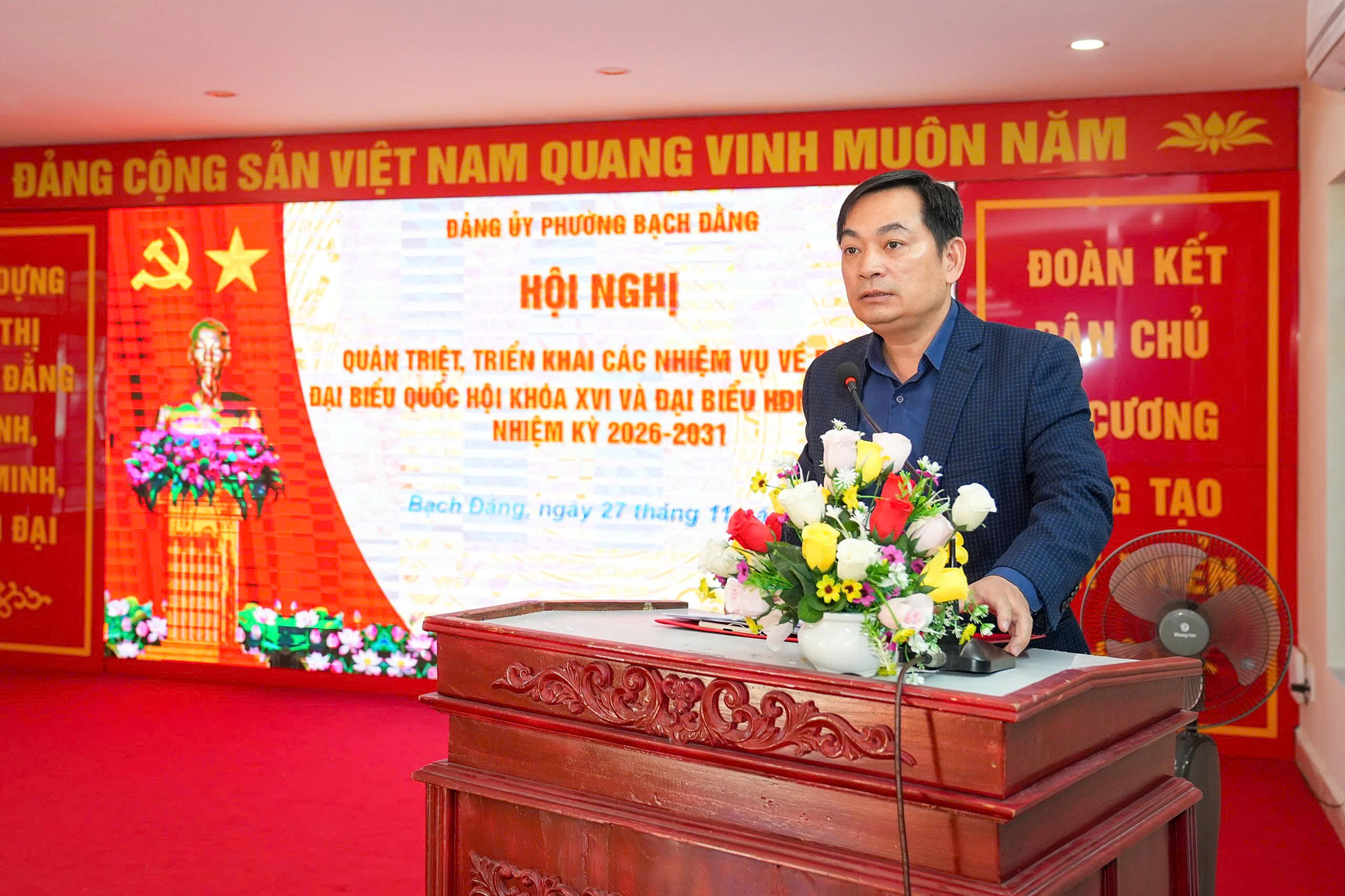 (Haiphong.gov.vn) - Sáng 27/11, Đảng ủy phường Bạch Đằng tổ chức Hội nghị quán triệt các Chỉ thị, Kết luận, Hướng dẫn của Trung ương, Thành ủy và Đảng ủy phường về công tác bầu cử đại biểu Quốc hội khóa XVI và đại biểu HĐND các cấp nhiệm kỳ 2026–2031; công bố các Quyết định thành lập Ban Chỉ đạo và Ủy ban bầu cử phường.