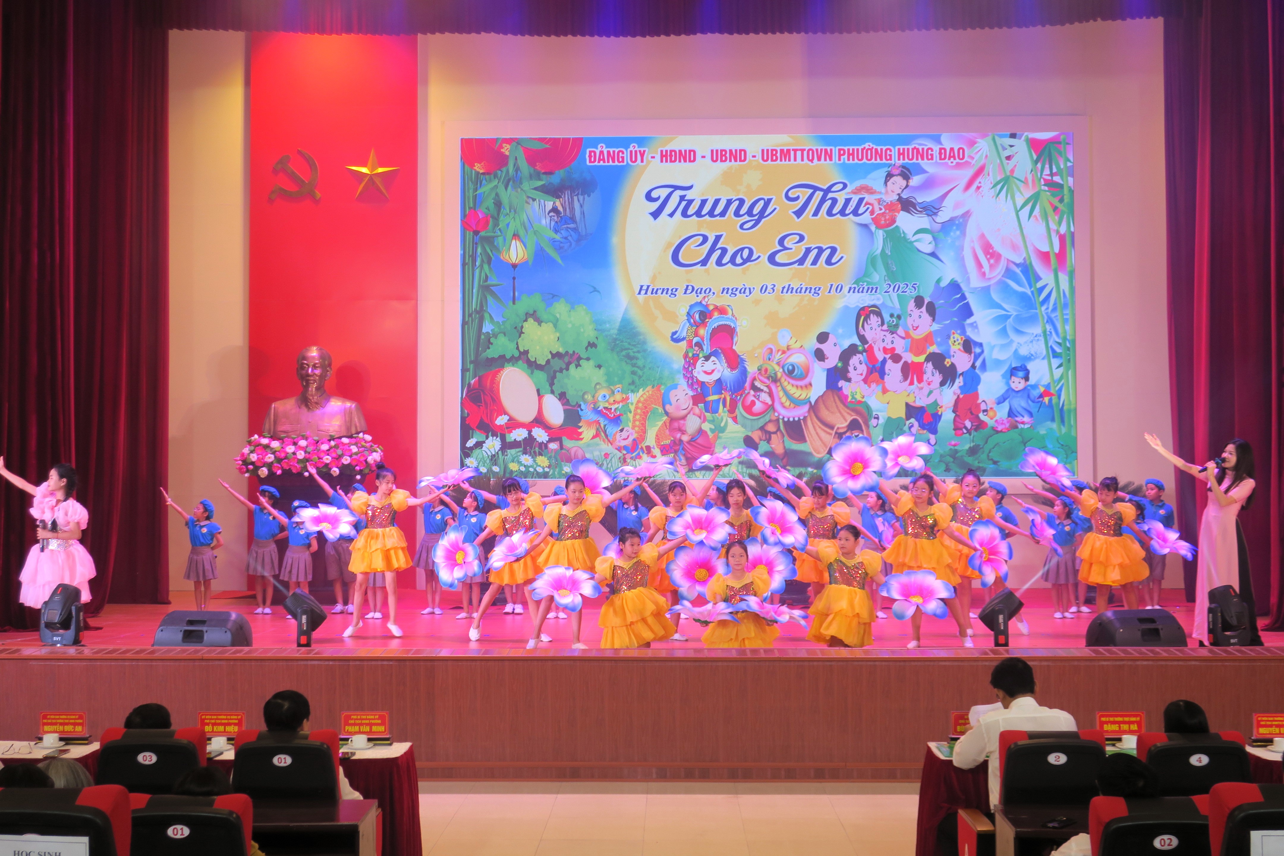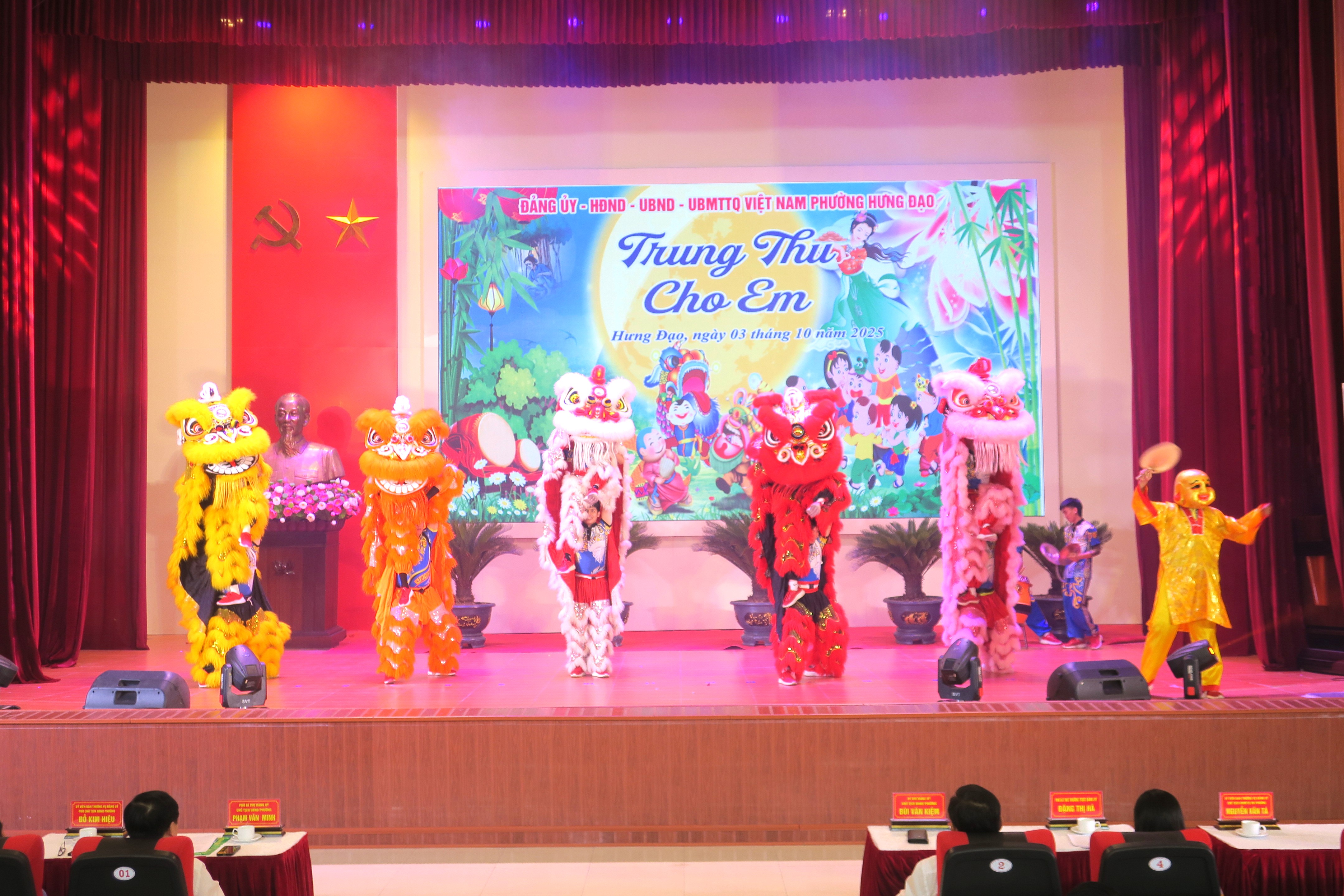 Các cháu tham gia các tiết mục văn nghệ,Phát biểu tại chương trình, đồng chí Vũ Đức Thiện, Phó Chủ tịch UBND phường Hưng Đạo, thay mặt lãnh đạo phường gửi tới các cháu thiếu niên, nhi đồng những tình cảm thân thương và lời chúc tốt đẹp nhất. Chúc các cháu đón Tết Trung thu vui tươi, đầm ấm, an toàn, bổ ích. Lãnh đạo phường mong các cháu luôn luôn thực hiện tốt 5 điều Bác Hồ dạy, trở thành con ngoan, trò giỏi, biết rèn luyện sức khoẻ, chủ động học hỏi, trang bị các kiến thức, kĩ năng đặc biệt là kĩ năng tự học, kĩ năng công dân số. Đồng thời, cần có kỹ năng tự bảo vệ bản thân, có khả năng tự ứng phó với các nguy cơ bạo lực, xâm hại, tai nạn thương tích, để trở thành công dân phát triển toàn diện về thể chất, trí tuệ và tinh thần, là nguồn nhân lực có chất lượng cho quê hương, đất nước.