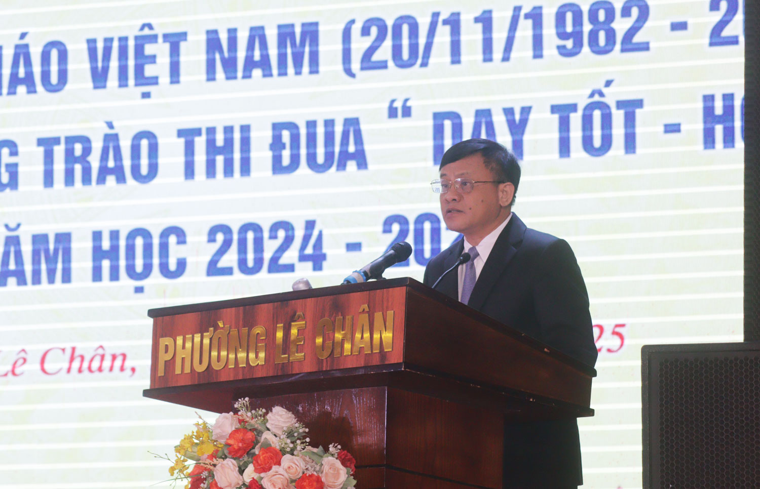 Đồng chí Đặng Đông Anh, Bí thư Đảng ủy, Chủ tịch HĐND phường phát biểu tại chương trình.Phát biểu chỉ đạo tại chương trình, đồng chí Đặng Đông Anh, Bí thư Đảng ủy, Chủ tịch HĐND phường biểu dương, ghi nhận và tri ân những đóng góp to lớn của các thế hệ nhà giáo, cán bộ quản lý giáo dục - những người đã đặt nền móng, gây dựng và phát triển sự nghiệp giáo dục phường Lê Chân hôm nay.