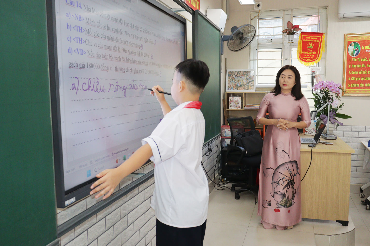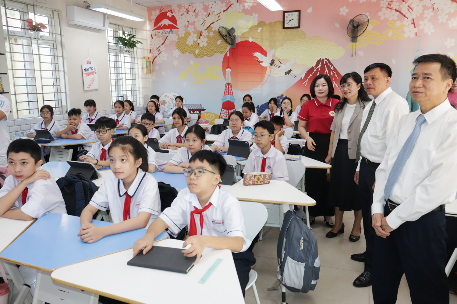 Các đại biểu bấm nút ra mắt “Phòng học thông minh, tương tác đa phương tiện” tại Trường THCS Hoàng Diệu.Trong năm học 2024 - 2025, được sự quan tâm của phường Lê Chân, Trường THCS Hoàng Diệu được trang bị thêm 2 phòng học thông minh, nâng số phòng học thông minh của nhà trường lên tổng số 3 phòng với 2 màn hình tivi thông minh và 54 Ipad cùng 1 laptop hiện đại đảm bảo đủ điều kiện cơ sở vật chất đáp ứng cho quá trình dạy và học của giáo viên và học sinh nhà trường. Bên cạnh việc đầu tư trang bị cơ sở vật chất, nhà trường chú trọng đến việc nâng cao trình độ, chuyên môn nghiệp vụ cho cán bộ, giáo viên, nhân viên trong trường. Ngoài việc tạo điều kiện về thời gian cho các thầy cô được tham gia tập huấn tại các lớp của Sở Giáo dục và Đào tạo tổ chức, Ban giám hiệu nhà trường đã chủ động mở các lớp tập huấn ngay trong hè tại trường về cách thức tổ chức lớp học, cách sử dụng các thiết bị tại phòng học thông minh theo các môn học. Ngay sau đợt tập huấn, các thầy cô cùng các em học sinh đã thực hành trải nghiệm tại các phòng học thông minh với những tiết lên lớp đầy thú vị và bổ ích.