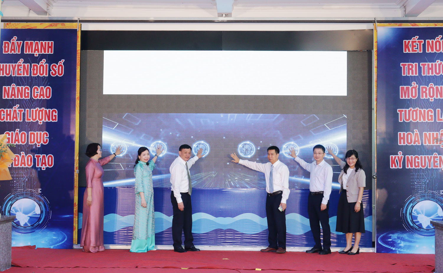 Các đại biểu bấm nút ra mắt “Thư viện số - không gian học tập mở cho học sinh” tại Trường Tiểu học Nguyễn Công Trứ.