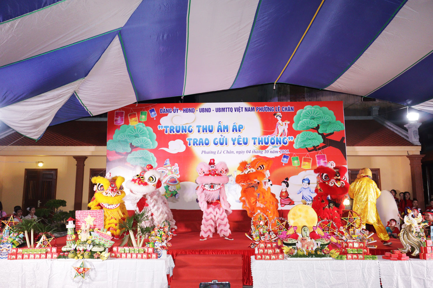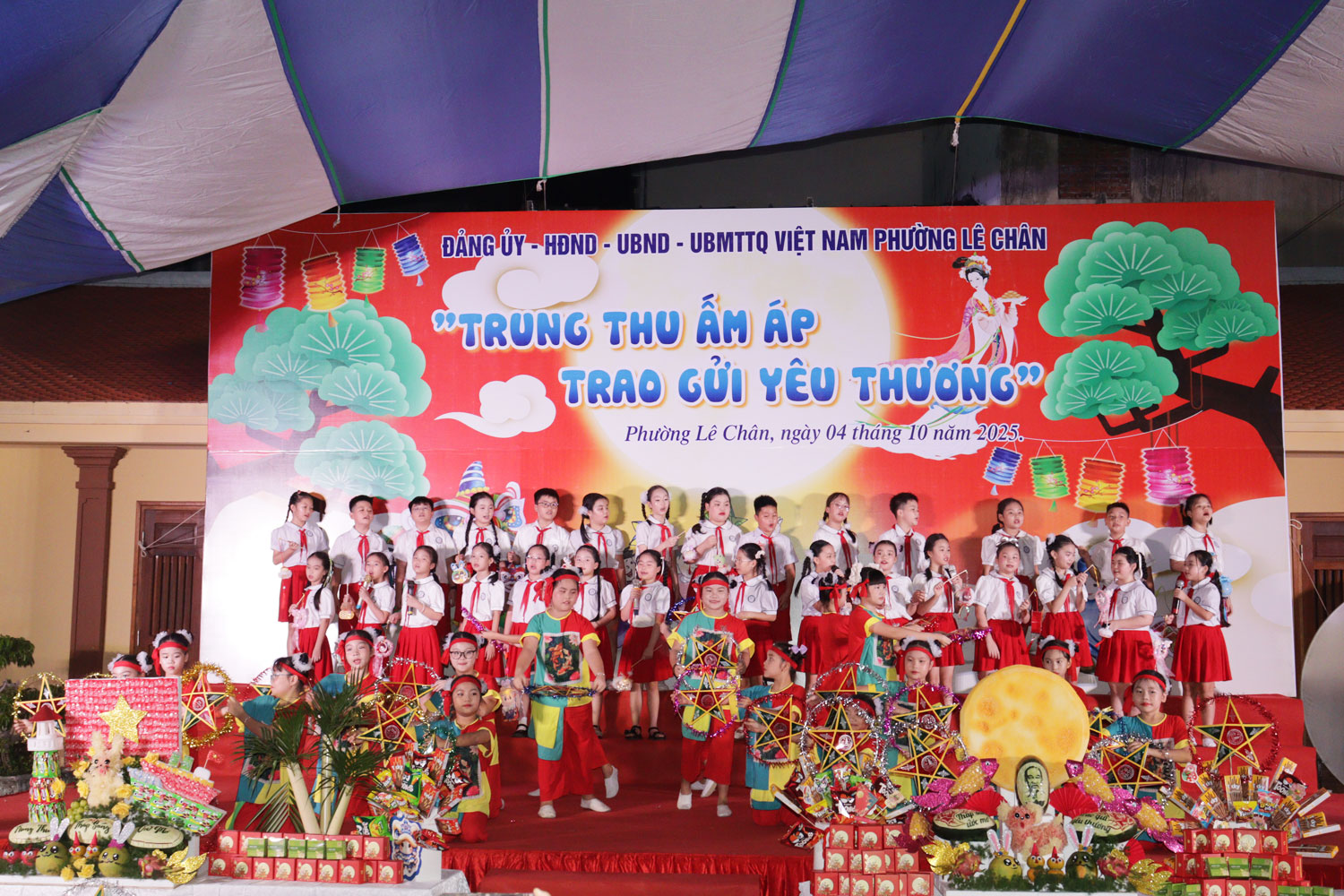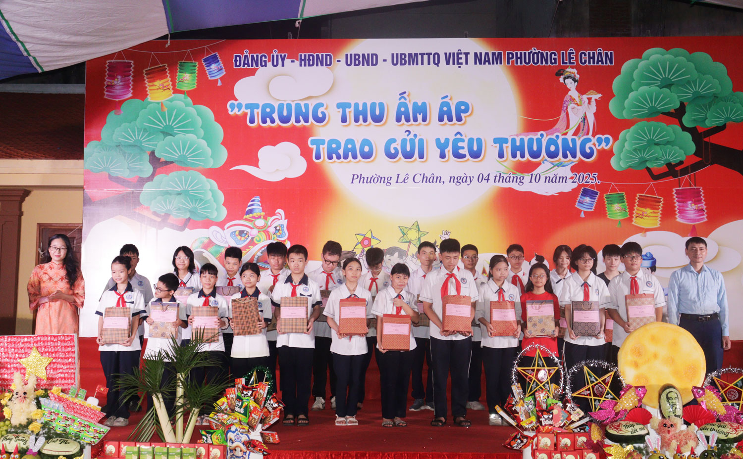 (Haiphong.gov.vn) - Tối 4/10, tại Đình An Biên, Đảng ủy - HĐND - UBND - Ủy ban MTTQ Việt Nam phường Lê Chân tổ chức chương trình Tết Trung thu năm 2025 với chủ đề “Trung thu ấm áp - Trao gửi yêu thương”.