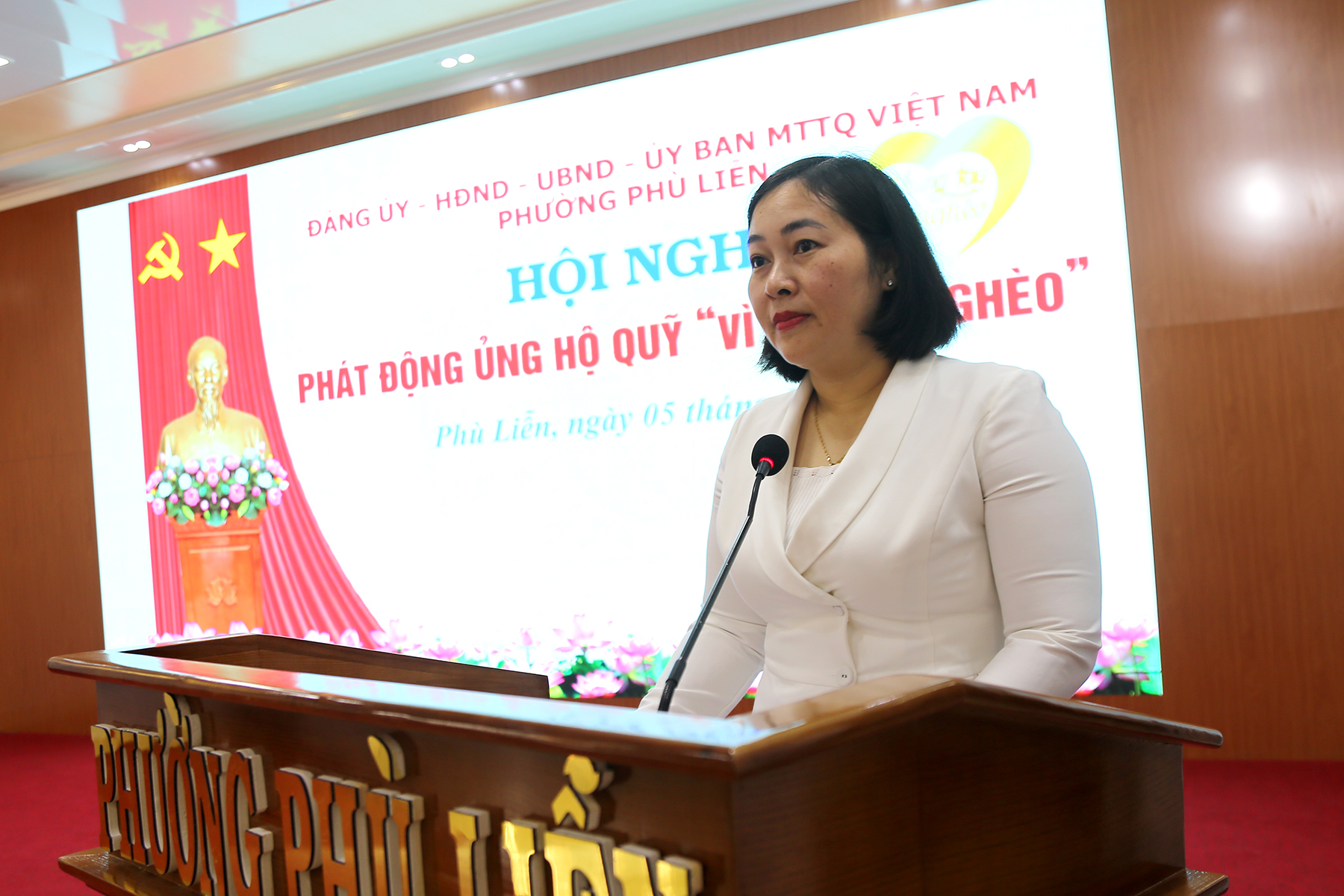 Chủ tịch Ủy ban MTTQ Việt Nam phường Hoàng Thị Minh Thúy triển khai Kế hoạch phát động Tháng cao điểm “Vì người nghèo” năm 2025.Tại Hội nghị, Chủ tịch Ủy ban MTTQ Việt Nam phường Phù Liễn Hoàng Thị Minh Thúy cho biết: hiện trên địa bàn phường có 197 hộ cận nghèo và nhiều hộ gia đình có hoàn cảnh khó khăn. Những năm qua, phường Phù Liễn đã huy động hiệu quả các nguồn lực xã hội, thực hiện tốt các chính sách hỗ trợ hộ nghèo, cận nghèo, góp phần nâng cao đời sống vật chất và tinh thần của Nhân dân.