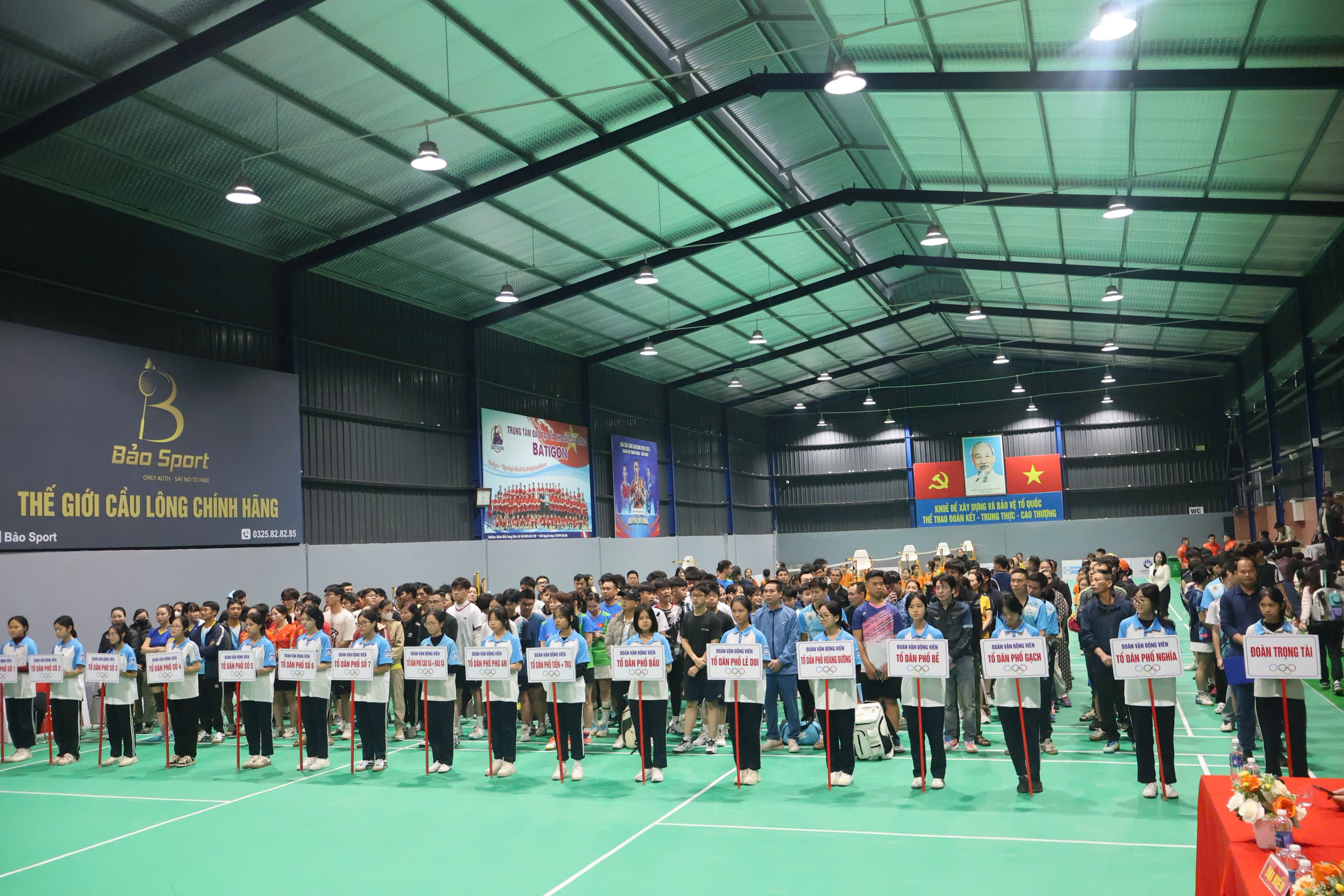 Quang cảnh lễ khai mạc Đại hội thu hút sự tham gia của trên 300 vận động viên đến từ các tổ dân phố, cơ quan, đơn vị, tranh tài ở các môn thi đấu như: bóng chuyền hơi, cầu lông…