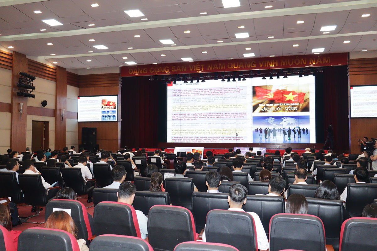 Các đại biểu dự tại điểm cầu Hải Phòng.Tại Hội nghị, các đại biểu đã nghe đồng chí Nguyễn Đức Hiển, Phó Trưởng Ban Kinh tế Trung ương báo cáo nội dung chủ yếu của Nghị quyết; đồng chí Trần Duy Đông, Thứ trưởng Bộ Kế hoạch và Đầu tư báo cáo Chương trình hành động của Chính phủ thực hiện Nghị quyết; đồng chí Phạm Tấn Công, Bí thư Đảng đoàn, Chủ tịch Liên đoàn Thương mại và Công nghiệp Việt Nam báo cáo Chương trình hành động của Đảng đoàn VCCI thực hiện Nghị quyết.