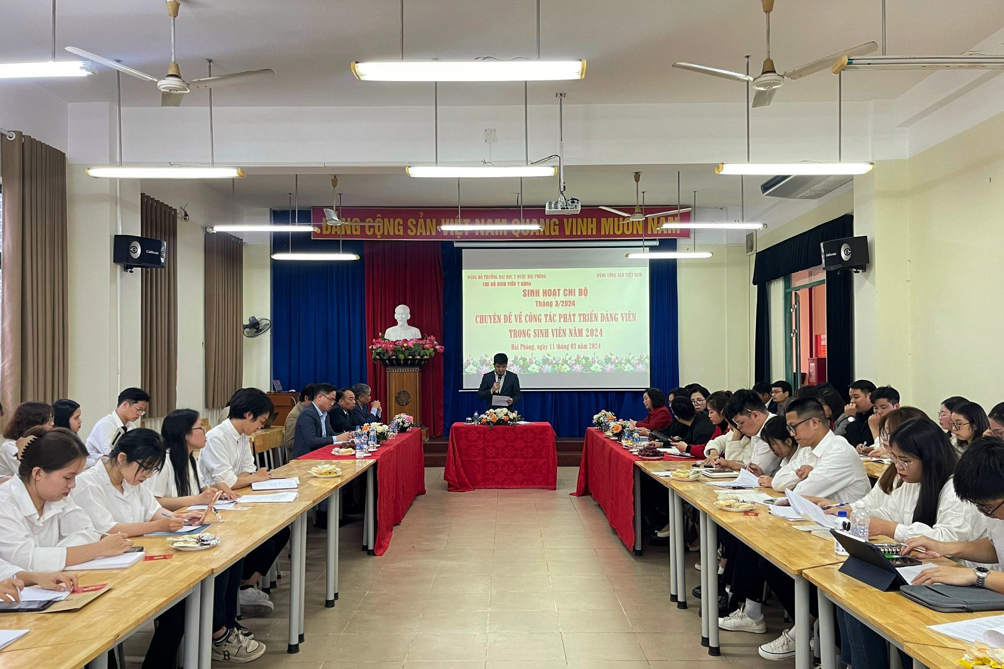 Sinh hoạt chuyên đề “Công tác phát triển Đảng trong sinh viên năm 2024” tại chi bộ sinh viên Y khoa,Trường Đại học Y - Dược Hải Phòng.Chương trình sinh hoạt chuyên đề lần này diễn ra vào tháng 3 – tháng Thanh niên giúp nâng cao nhận thức của cấp uỷ chi bộ, đảng viên về tầm quan trọng của việc phát triển Đảng trong sinh viên hiện nay. Buổi sinh hoạt chia sẻ, giải đáp những thắc mắc và định hướng về công tác phát triển Đảng đối với đảng viên, đoàn viên và sinh viên. Đây cũng là dịp gặp gỡ, chia sẻ giữa Đảng ủy Trường với cấp ủy chi bộ, các đảng viên là sinh viên Y khoa.
