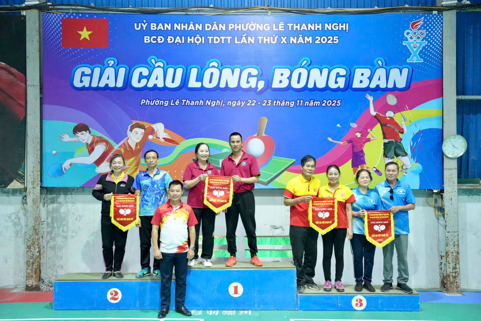 Ban Tổ chức trao giải cho vận động viên đạt thành tích cao nội dung đôi nam nữ môn cầu lôngĐại hội TDTT phường Lê Thanh Nghị được tổ chức từ ngày 19/10/2025 với tổng cộng 9 môn thi đấu gồm: Dân vũ, Bóng bàn, Cầu lông, Kéo co, Cờ vua, Cờ tướng, Bóng chuyền hơi, Chạy tập thể và Võ karate. Đến nay, Ban Tổ chức đã hoàn thành thi đấu 6/9 môn; 03 môn còn lại dự kiến sẽ được tiếp tục tổ chức vào các ngày 29 và 30/11.