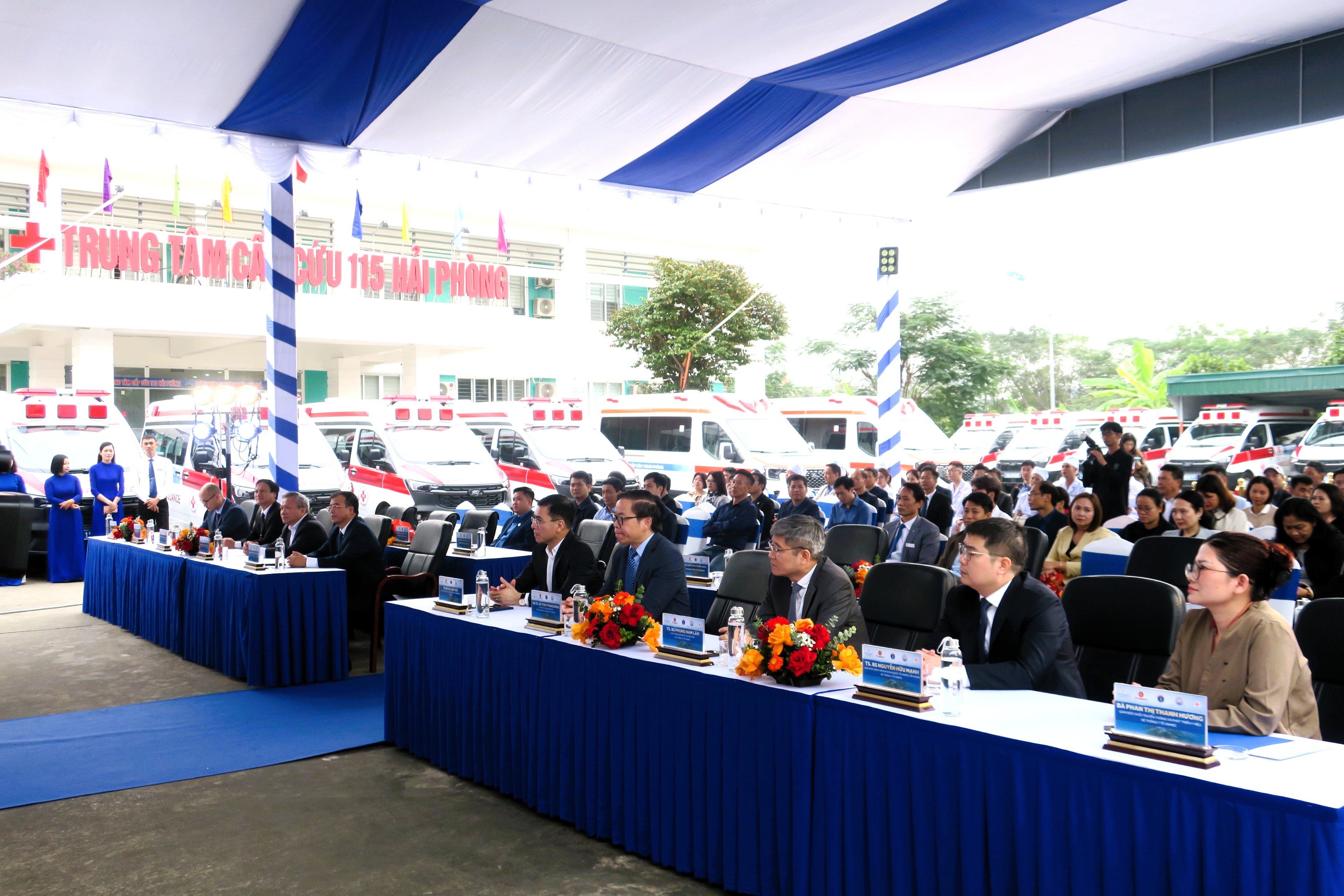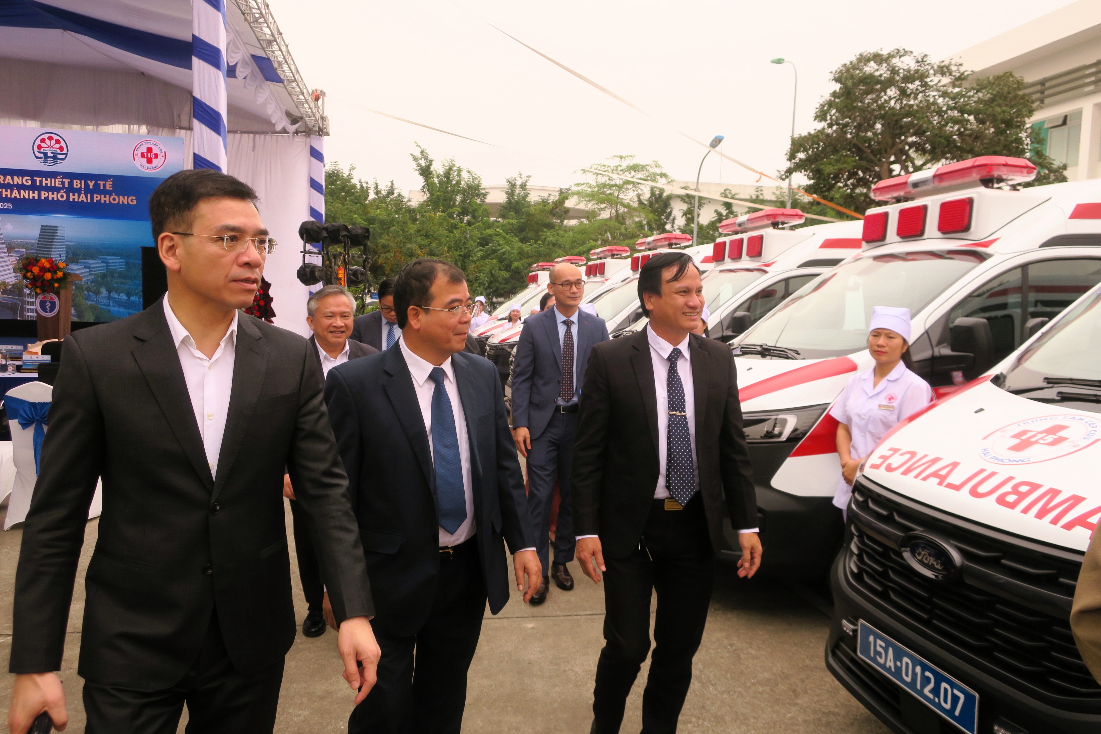Các đồng chí lãnh đạo trao tặng, tiếp nhận tài trợ.Phát biểu tại Lễ bàn giao, Phó Chủ tịch UBND thành phố Nguyễn Minh Hùng cho biết: Thành phố xác định hệ thống cấp cứu ngoại viện chuyên nghiệp không chỉ bảo vệ tính mạng người dân mà còn là một trong những nền tảng để Hải Phòng phát triển thành trung tâm dịch vụ y tế chất lượng cao trong khu vực, là điểm đến an toàn cho du khách, nhà đầu tư và cộng đồng quốc tế.
