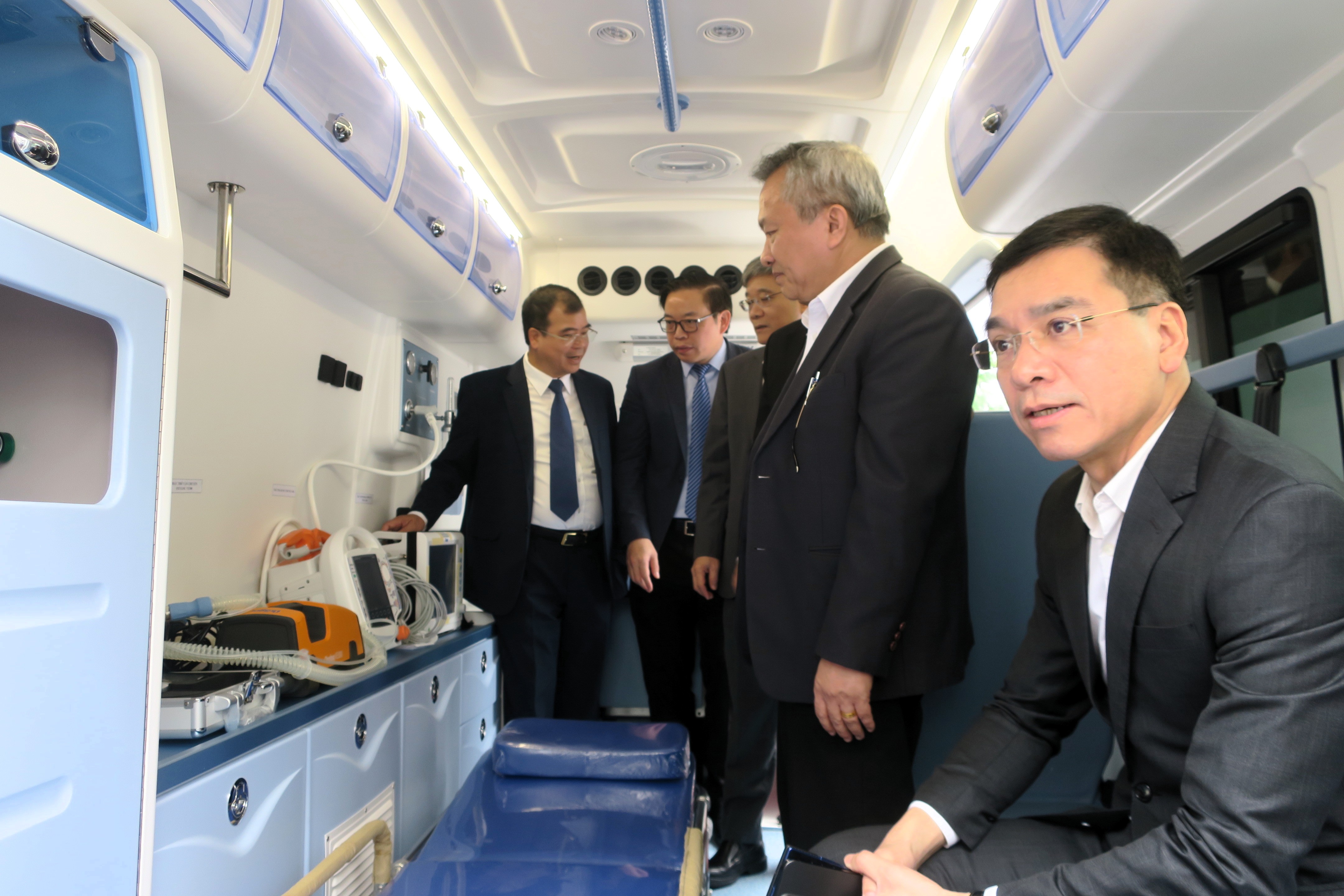 Đại biểu tham quan xe cứu thương.Phó Chủ tịch UBND thành phố khẳng định, Lễ bàn giao đánh dấu một bước đi quan trọng, góp phần hiện thực hóa mục tiêu lớn nhất là bảo đảm sức khỏe và sự an toàn cho nhân dân. Thông qua đó, giúp thành phố từng bước triển khai thực hiện các mục tiêu quan trọng của Đề án thí điểm cấp cứu ngoại viện của Bộ Y tế nhằm rút ngắn thời gian tiếp cận người bệnh; nâng cao chất lượng xử trí tại hiện trường; hiện đại hóa phương tiện và trang thiết bị cấp cứu; chuẩn hóa năng lực đội ngũ nhân viên y tế và từng bước xây dựng mô hình cấp cứu ngoại viện thông minh, liên ngành, kết nối toàn diện.