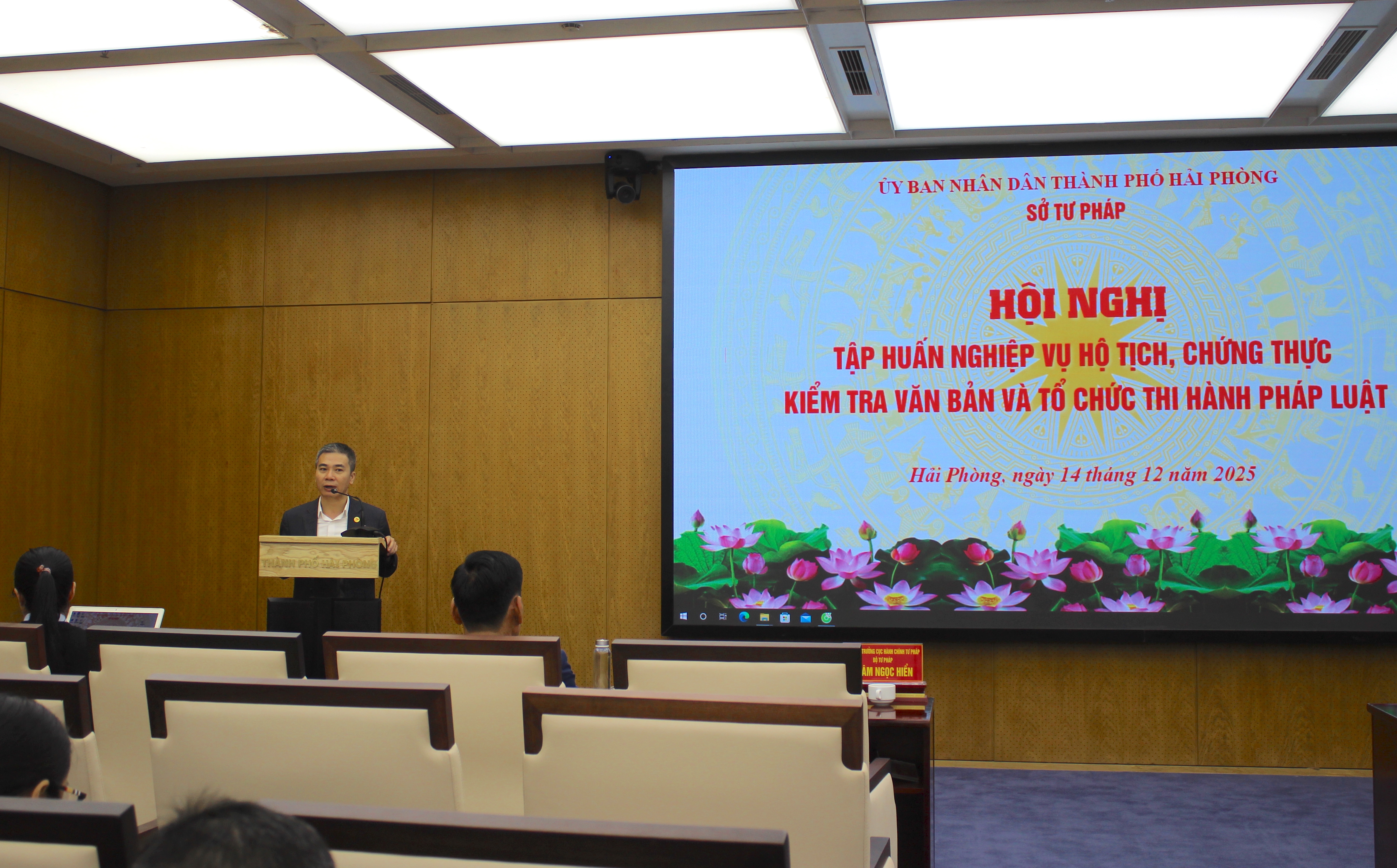 (Haiphong.gov.vn) – Sáng 14/12, Sở Tư pháp thành phố Hải Phòng tổ chức Hội nghị tập huấn chuyên sâu nghiệp vụ hộ tịch, chứng thực, công tác kiểm tra văn bản quy phạm pháp luật và tổ chức thi hành pháp luật. Hội nghị được tổ chức tại 2 địa điểm, gồm điểm cầu trực tiếp tại Trung tâm Hội nghị và Biểu diễn thành phố, đồng thời kết nối trực tuyến tới Khách sạn Đồng Xanh.