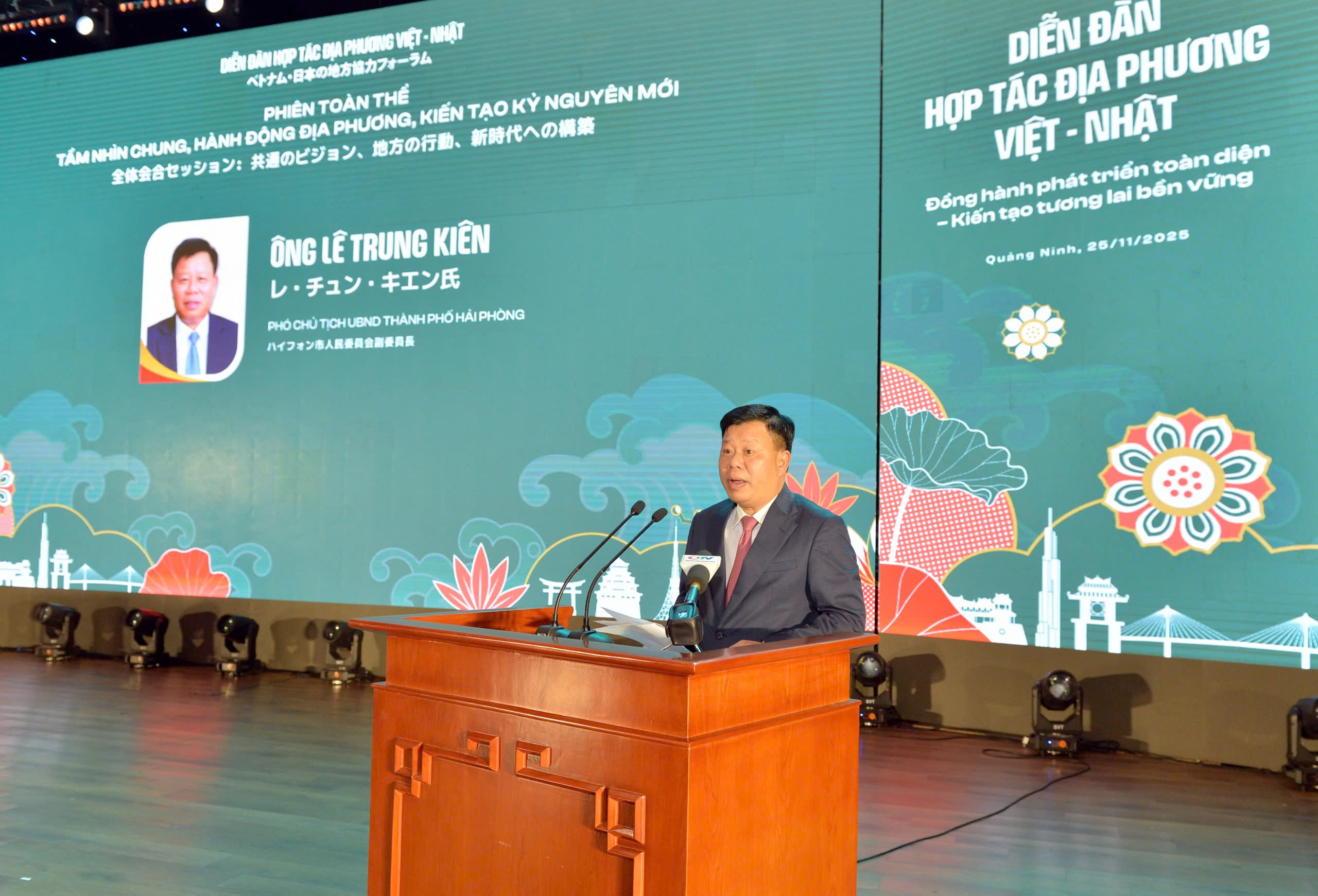 Phó Chủ tịch UBND thành phố Hải Phòng Lê Trung Kiên phát biểu tại Phiên toàn thể của diễn đàn.Phát biểu tại Phiên toàn thể của diễn đàn với chủ đề: Tầm nhìn chung – Hành động địa phương - Kiến tạọ kỷ nguyên mới, Phó Chủ tịch UBND thành phố Hải Phòng Lê Trung Kiên nhấn mạnh: Hợp tác Hải Phòng – Nhật Bản phát triển mạnh trên đầu tư, thương mại, giáo dục và hợp tác địa phương. Nhật Bản có 215 dự án FDI với 6,4 tỷ USD, nhiều tập đoàn lớn chọn Hải Phòng làm điểm đến, cùng các dự án ODA tạo dấu ấn về hạ tầng và môi trường. Quan hệ thương mại tăng trưởng ổn định; giáo dục – đào tạo và giao lưu văn hóa phát triển sâu rộng. Hải Phòng khẳng định vai trò hợp tác cấp địa phương và đề xuất mở rộng kết nối, thu hút đầu tư, phát triển nguồn nhân lực và đổi mới sáng tạo.