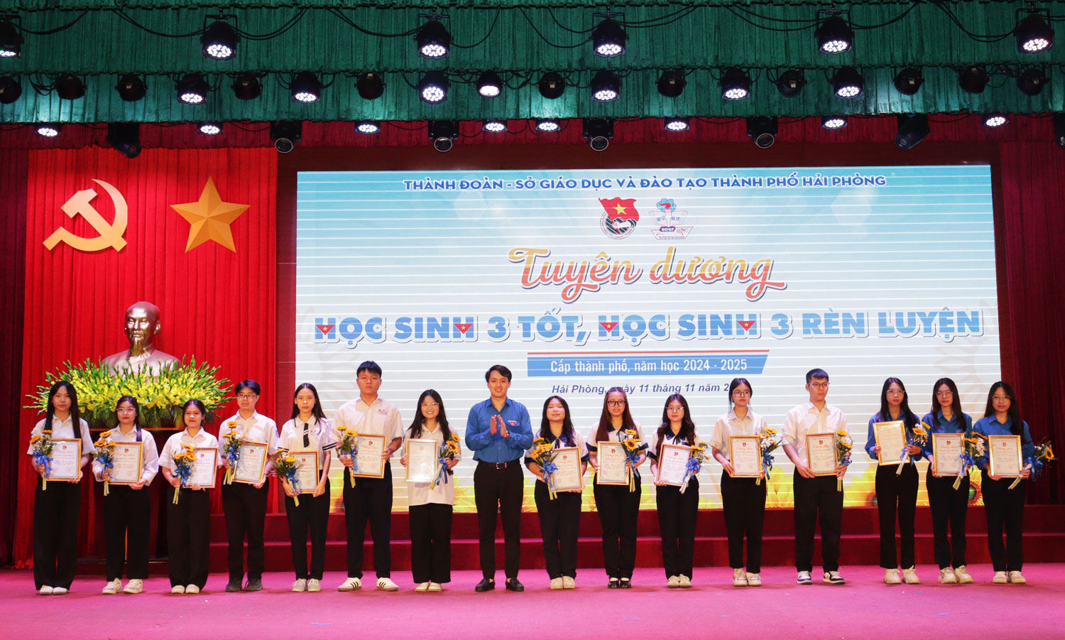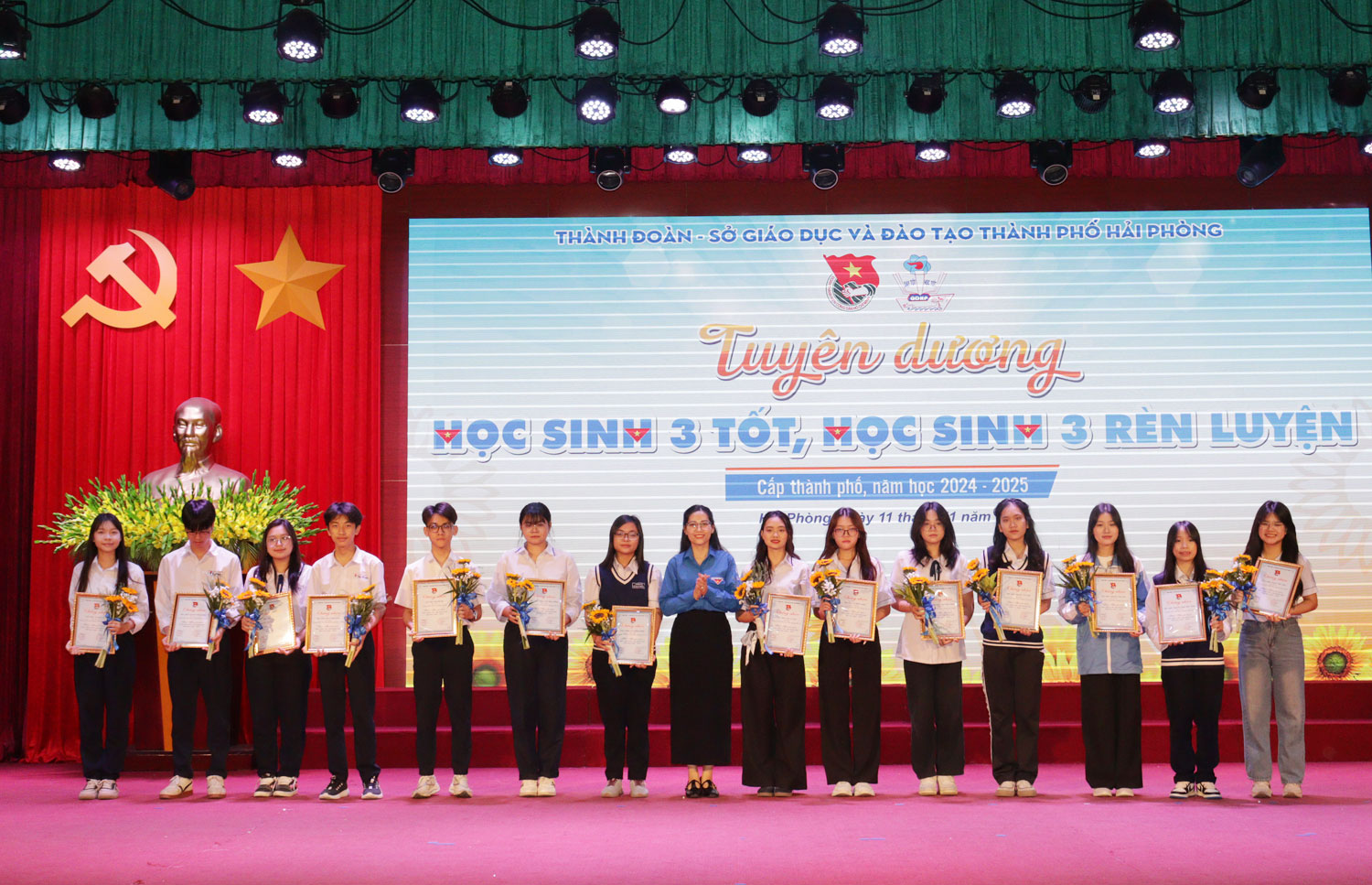 Các học sinh được tuyên dương danh hiệu “Học sinh 3 tốt”, “Học sinh 3 rèn luyện” cấp thành phố năm học 2024 - 2025.Nhân dịp này, 100 học sinh được tuyên dương danh hiệu “Học sinh 3 tốt”, “Học sinh 3 rèn luyện” cấp thành phố năm học 2024 - 2025, trở thành tấm gương sáng trong học tập và rèn luyện của tuổi trẻ Hải Phòng./.