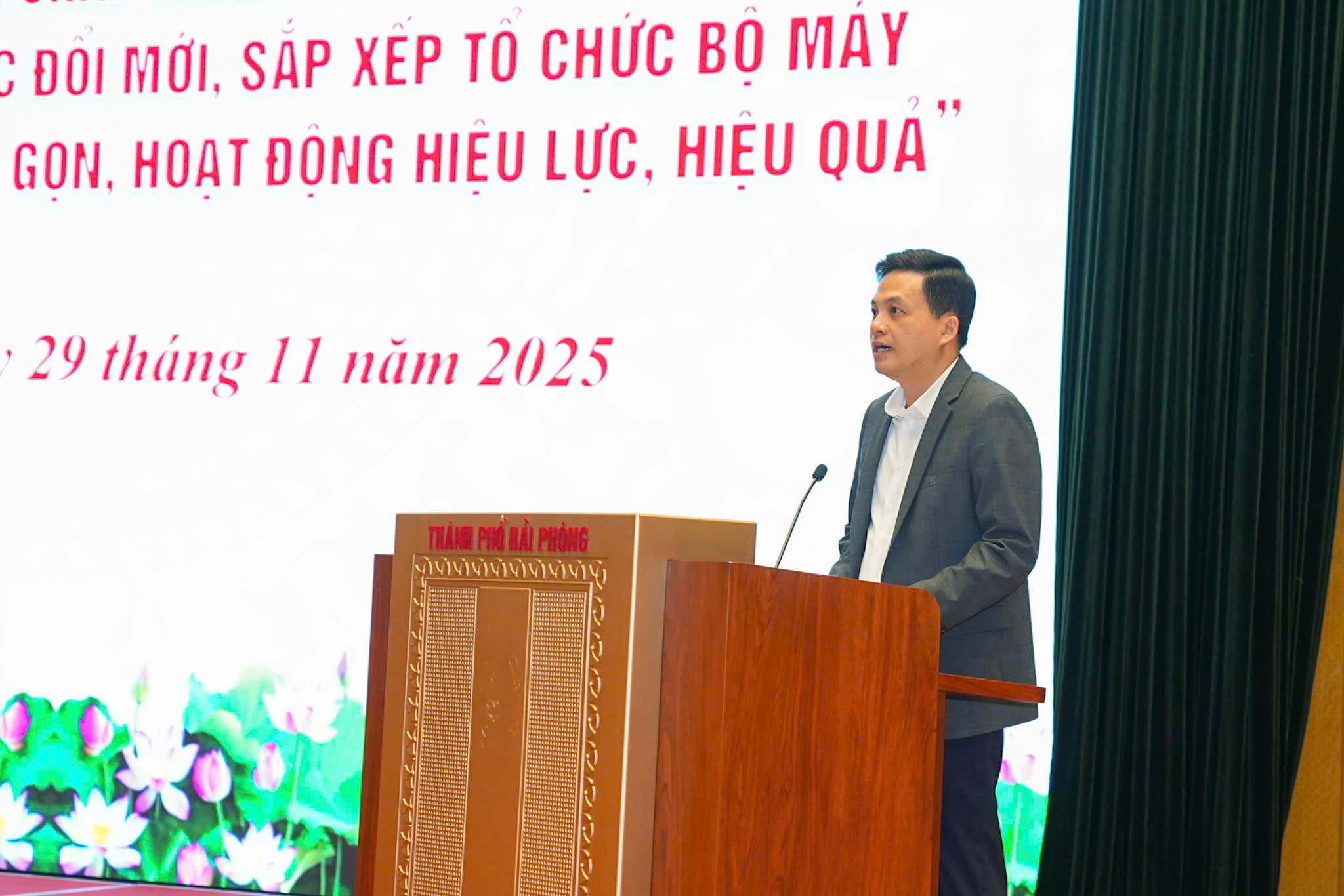 Lãnh đạo Ban Tổ chức Thành ủy báo cáo tại Hội nghị.Triển khai thực hiện chính quyền địa phương 2 cấp trên địa bàn thành phố Hải Phòng có sự chỉ đạo, triển khai quyết liệt, thống nhất của Thành ủy, HĐND, UBND, Ủy ban Mặt trận Tổ quốc Việt Nam thành phố ngay từ ngày đầu đi vào hoạt động (ngày 01/7/2025). Mô hình chính quyền địa phương 2 cấp hoạt động ngày càng nề nếp, cơ bản thông suốt, không bị gián đoạn, phục vụ tốt yêu cầu của Nhân dân và doanh nghiệp. Thành phố kịp thời sắp xếp, kiện toàn tổ chức bộ máy, cán bộ theo chỉ đạo của Trung ương; bố trí cán bộ, công chức, viên chức làm việc tại các địa phương, cơ quan, đơn vị, đưa hệ thống chính trị thành phố đi vào hoạt động theo mô hình mới ngay từ ngày 01/7/025.