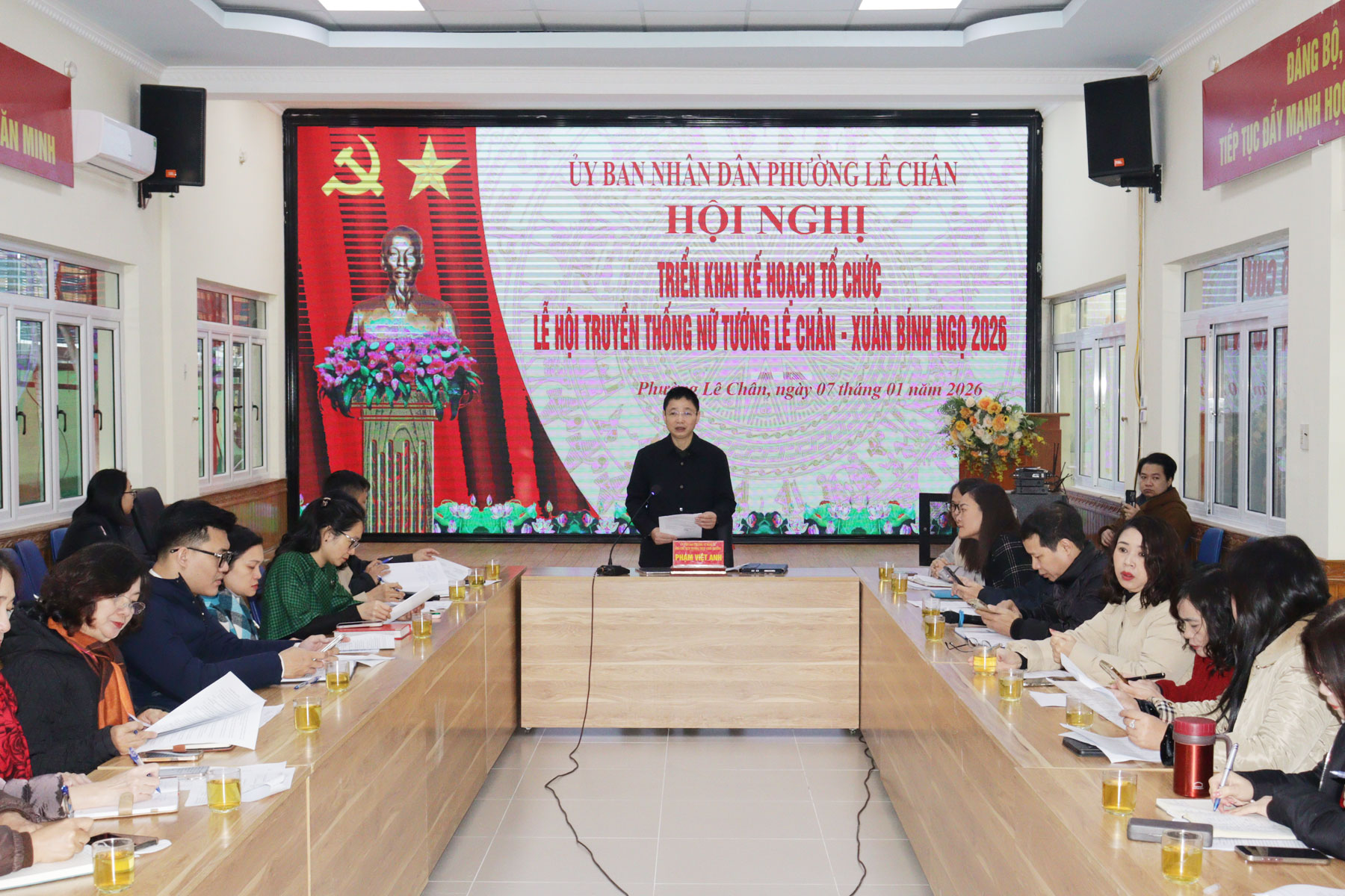 (Haiphong.gov.vn) - Sáng 7/01, UBND phường Lê Chân tổ chức Hội nghị triển khai Kế hoạch tổ chức Lễ hội truyền thống Nữ tướng Lê Chân - Xuân Bính Ngọ năm 2026. Đồng chí Phạm Việt Anh, Phó Chủ tịch Thường trực UBND phường chủ trì Hội nghị. Cùng dự có đại diện lãnh đạo các Sở, ngành, đơn vị liên quan.