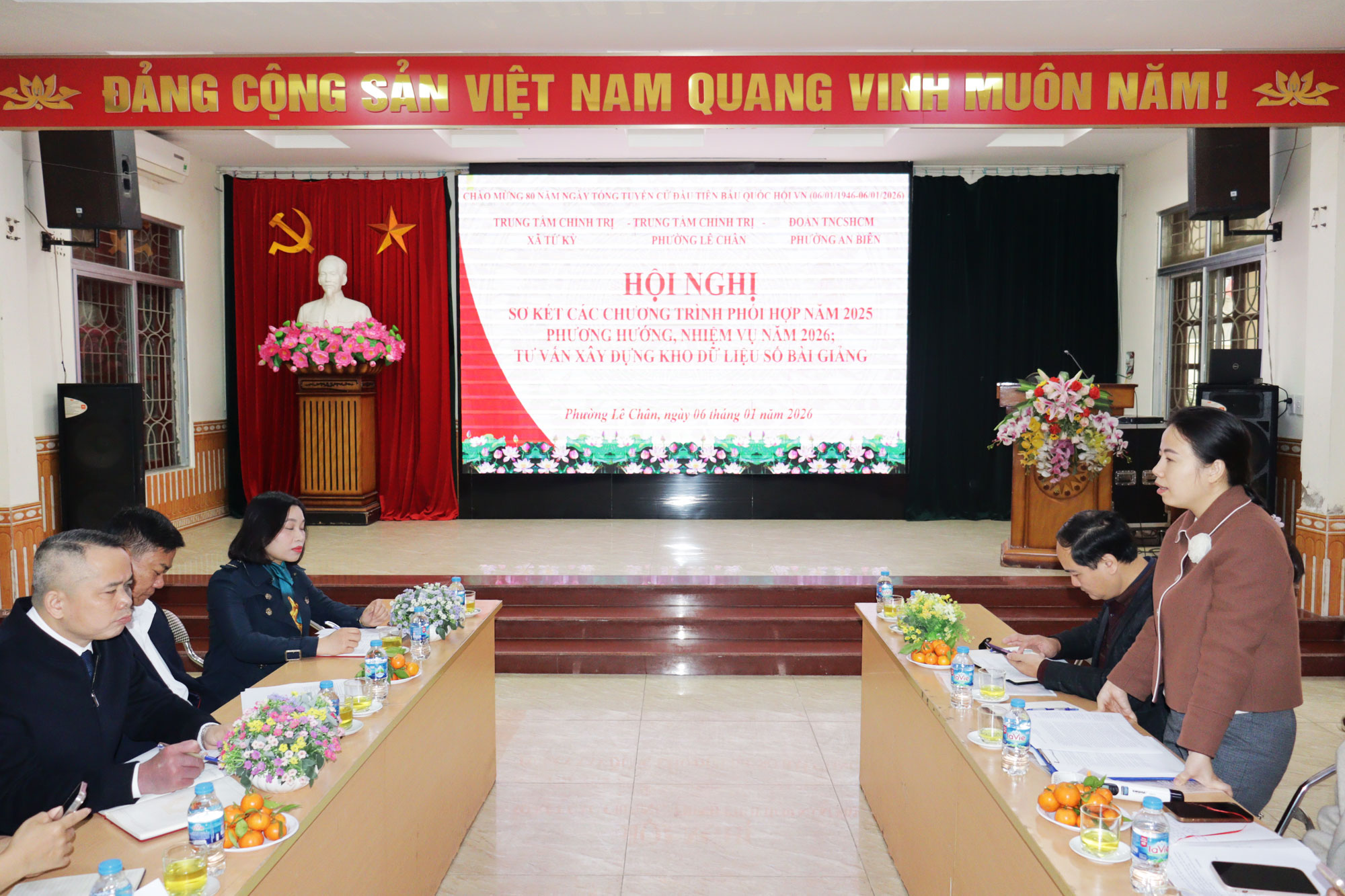 (Haiphong.gov.vn) - Sáng 6/01, Trung tâm Chính trị phường Lê Chân phối hợp với Trung tâm Chính trị xã Tứ Kỳ, Đoàn TNCS Hồ Chí Minh phường An Biên tổ chức Hội nghị sơ kết các chương trình phối hợp năm 2025 và tư vấn xây dựng kho dữ liệu số bài giảng. Dự Hội nghị có đại diện Ban Tuyên giáo và Dân vận Thành ủy, Trường Chính trị Tô Hiệu.