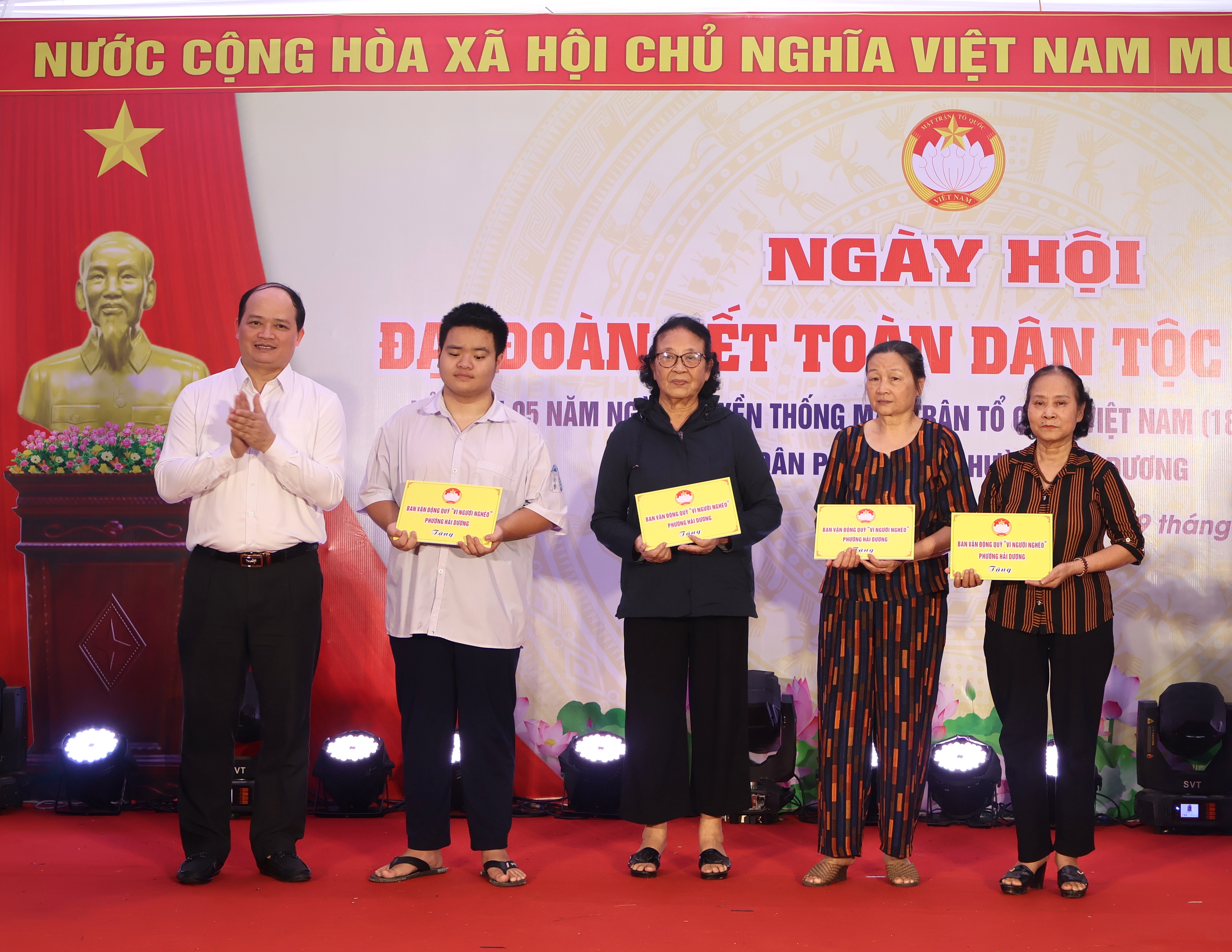 Đồng chí Phạm Công Quân, Bí thư Đảng ủy, Chủ tịch HĐND phường trao quà cho các trường hợp có hoàn cảnh khó khăn của Tổ dân phố 35Đồng chí nhấn mạnh, đại đoàn kết dân tộc là truyền thống quý báu, là sức mạnh to lớn của cách mạng Việt Nam. Trong bối cảnh đất nước bước vào giai đoạn phát triển mới, Hải Phòng đang phấn đấu trở thành trung tâm kinh tế – xã hội đứng thứ ba cả nước, việc phát huy sức mạnh khối đại đoàn kết toàn dân tộc càng có ý nghĩa đặc biệt quan trọng. Đồng chí đề nghị Đảng ủy, chính quyền, Mặt trận Tổ quốc và các đoàn thể phường Hải Dương tiếp tục củng cố hệ thống chính trị vững mạnh, tuyên truyền sâu rộng chủ trương, đường lối của Đảng, chính sách pháp luật của Nhà nước; tăng cường công tác hòa giải ở cơ sở, giữ gìn an ninh trật tự, bảo đảm môi trường sống an toàn, xanh – sạch – đẹp. Đồng thời, cần đẩy mạnh chuyển đổi số trong đời sống Nhân dân, coi đây là nền tảng để nâng cao hiệu quả quản lý, phục vụ người dân tốt hơn và xây dựng phường Hải Dương ngày càng văn minh, hiện đại.
