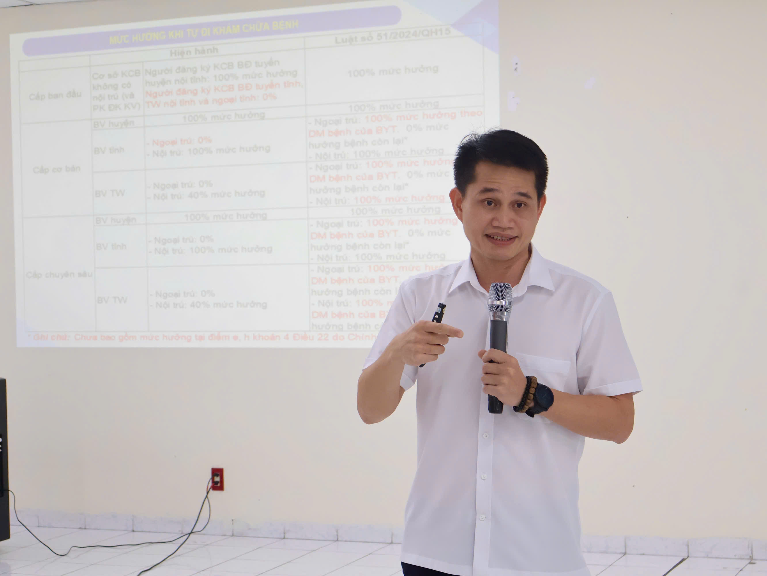 Ông Lương Hoàng Hải, Phó trưởng phòng Phòng Tuyên truyền và Hỗ trợ người tham gia BHXH (BHXH thành phố) thông tin về các quy định BHXH, BHYT sửa đổiTại buổi tuyên truyền, ông Lương Hoàng Hải, Phó trưởng phòng Phòng Tuyên truyền và Hỗ trợ người tham gia BHXH (BHXH thành phố) đã trực tiếp thông tin, giới thiệu đến đoàn viên, công nhân lao động những quy định của Luật Bảo hiểm xã hội (BHXH) và Luật Bảo hiểm y tế (BHYT) sửa đổi, bổ sung năm 2024. Trong đó, nhấn mạnh về trách nhiệm của người sử dụng lao động và người lao động; các chế độ, chính sách cho người lao động làm việc tại đơn vị, doanh nghiệp về khám sức khỏe định kỳ, tai nạn lao động, bệnh nghề nghiệp; chế độ thai sản, nghỉ ốm, nghỉ lễ, quy định về thanh toán khám chữa bệnh bảo hiểm y tế… Qua đó, giúp công nhân lao động có thêm kiến thức để bảo vệ quyền lợi hợp pháp, chính đáng của mình.