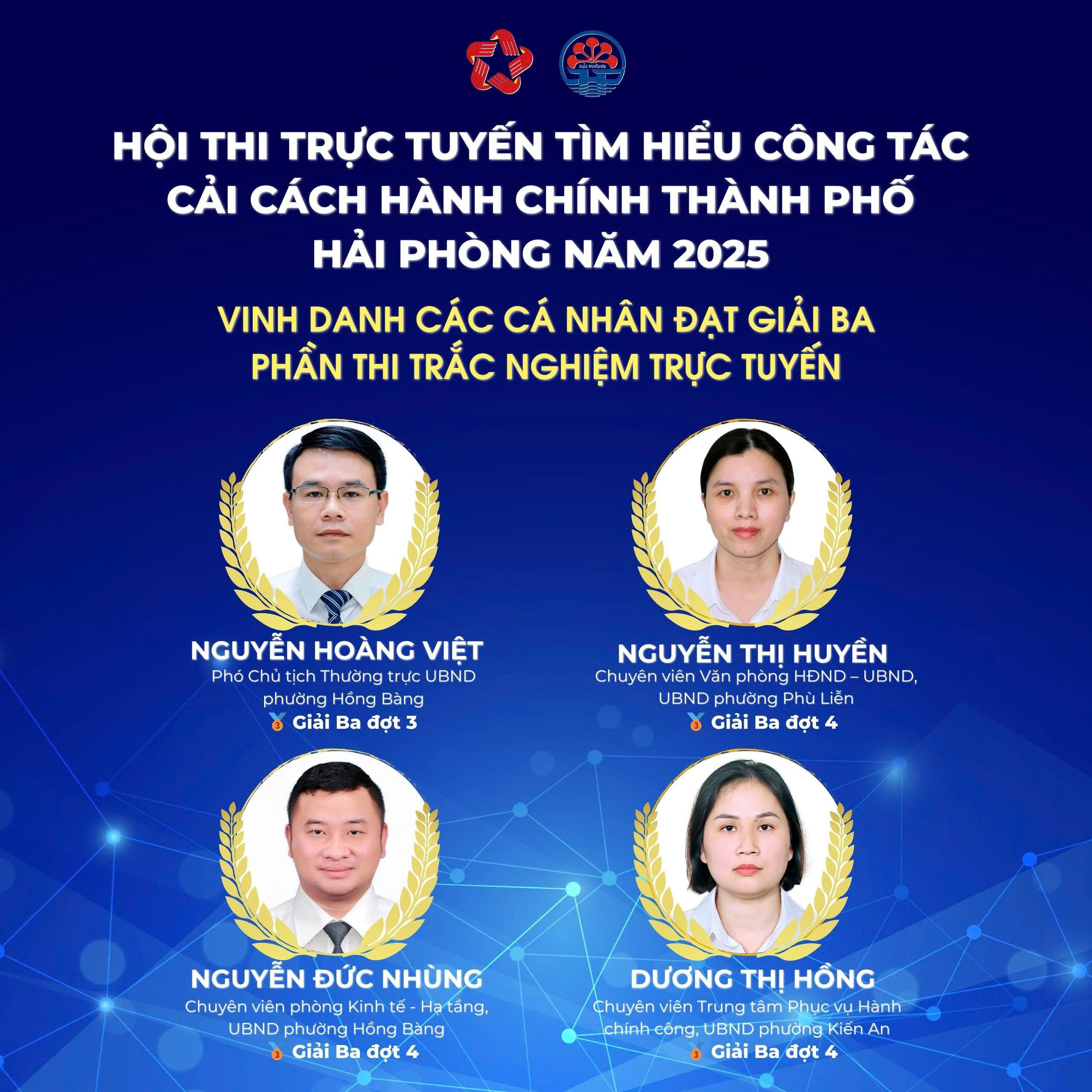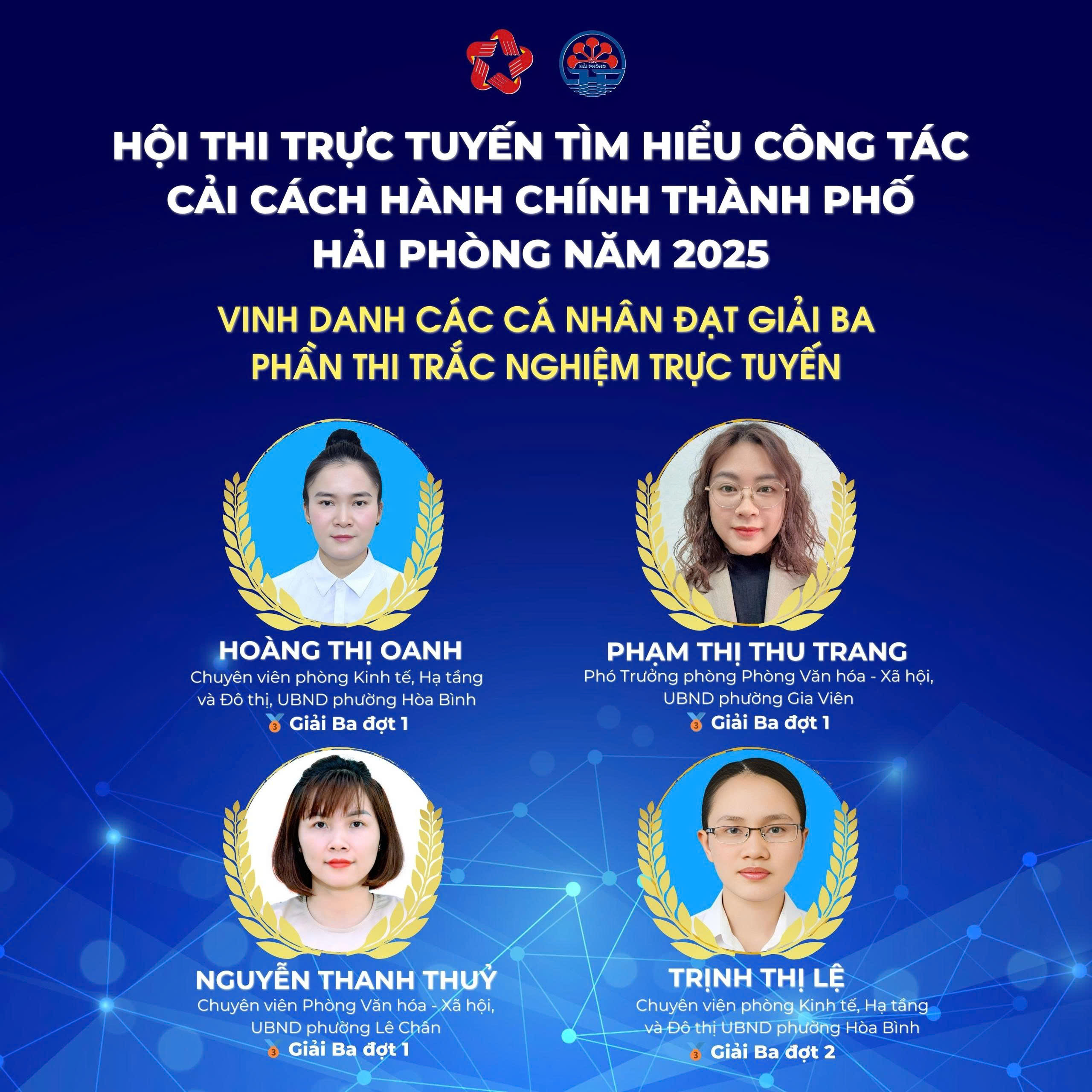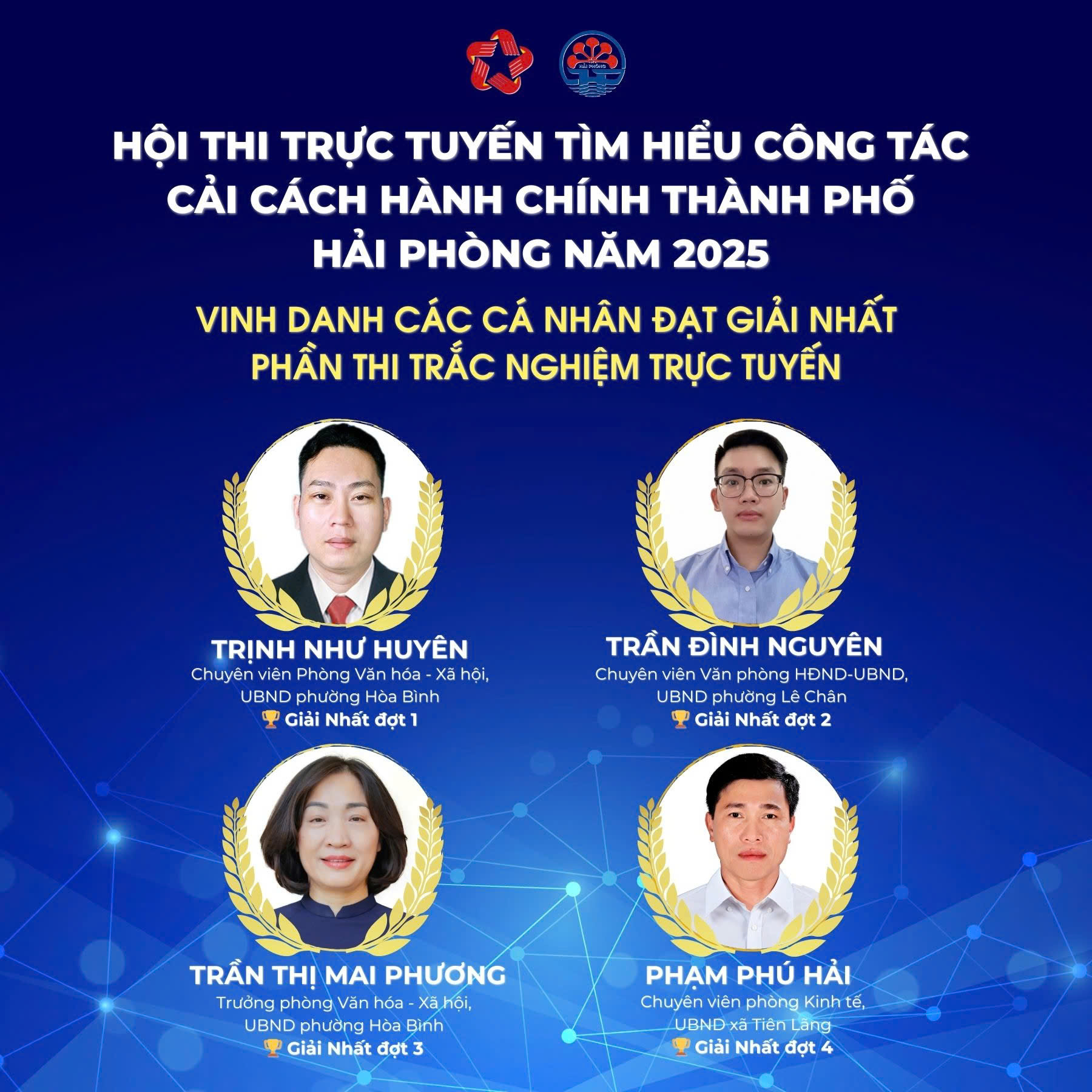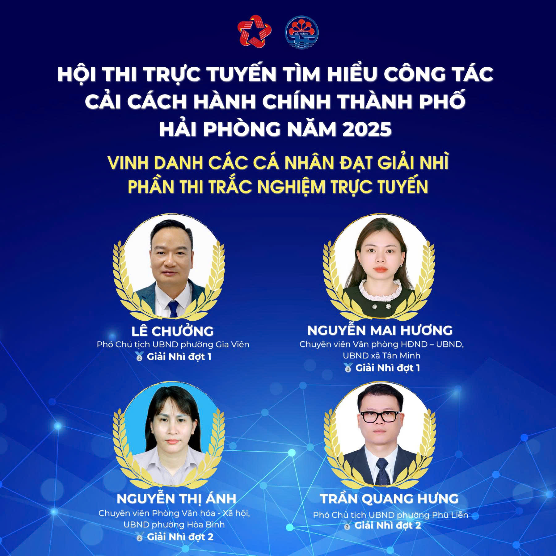 Các cá nhân đoạt giải Nhì cuộc thiNăm 2025 là năm thứ ba liên tiếp tổ chức Hội thi trực tuyến tìm hiểu công tác CCHC thành phố Hải Phòng. Hội thi gồm 02 phần thi: Một là thi trắc nghiệm trực tuyến tìm hiểu chủ trương của Đảng, chính sách, pháp luật của Nhà nước và các văn bản của Trung ương, của thành phố liên quan đến công tác CCHC được tổ chức làm 4 đợt, từ ngày 3 – 28/11/2025. Hai là: Thi xây dựng slogan tuyên truyền về CCHC.