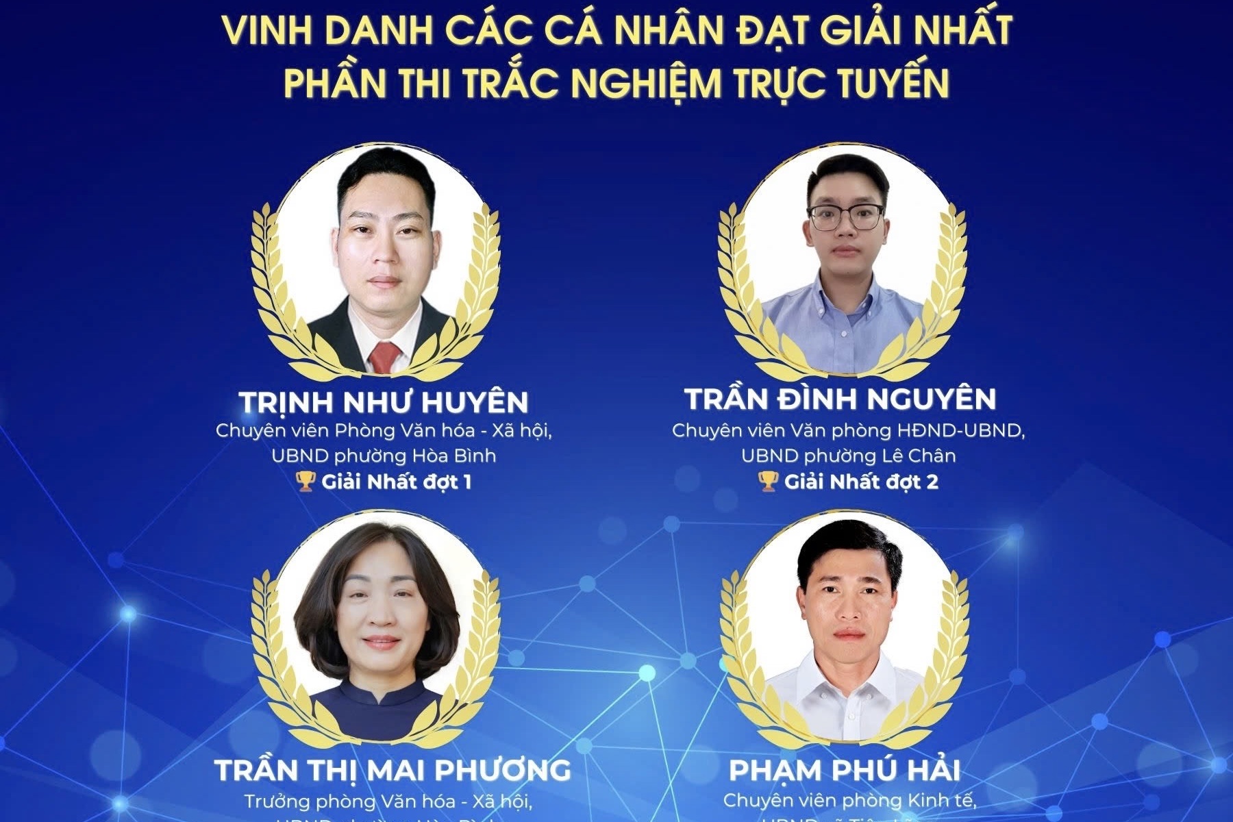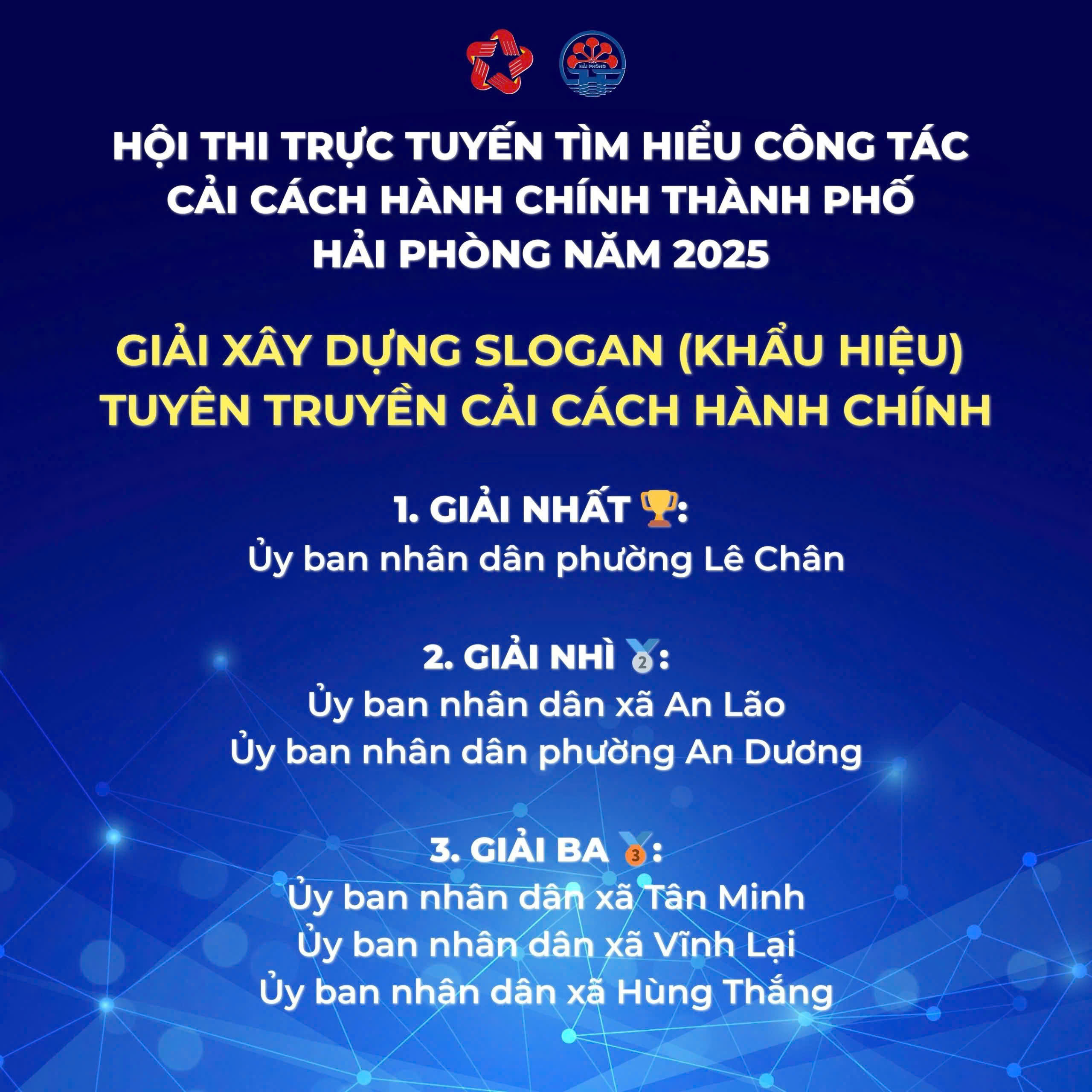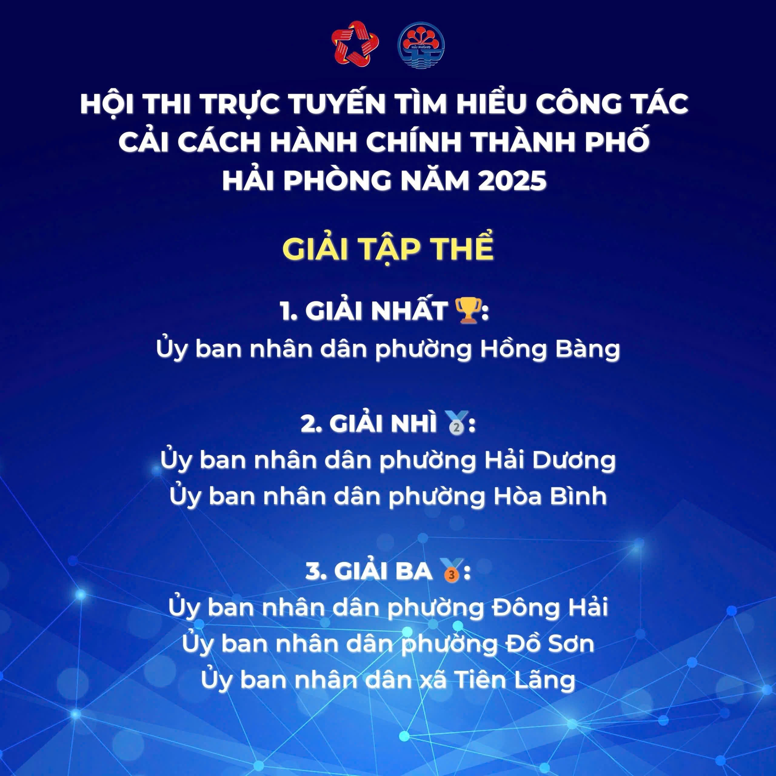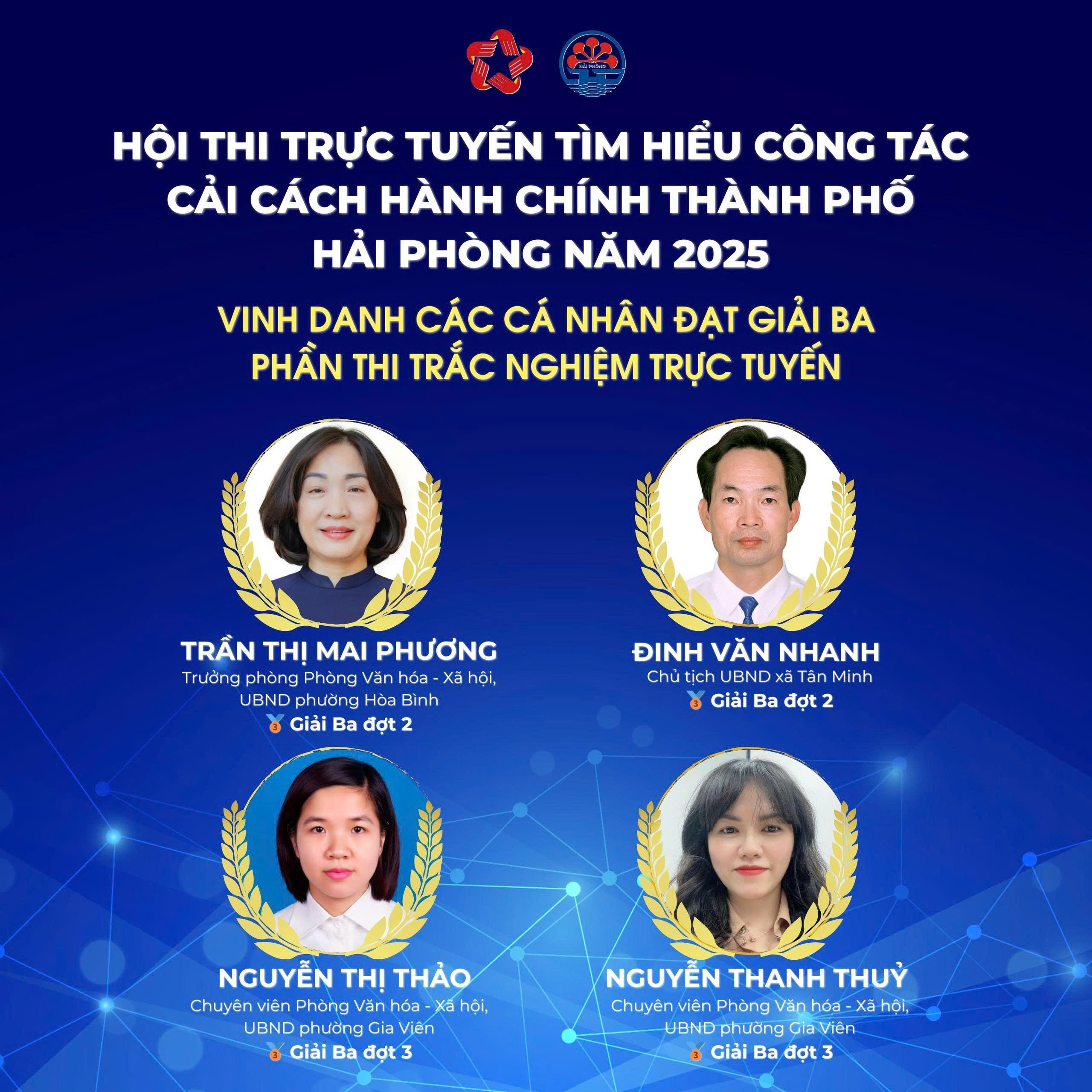Các cá nhân đoạt giải Nhì cuộc thiNăm 2025 là năm thứ ba liên tiếp tổ chức Hội thi trực tuyến tìm hiểu công tác CCHC thành phố Hải Phòng. Hội thi gồm 02 phần thi: Một là thi trắc nghiệm trực tuyến tìm hiểu chủ trương của Đảng, chính sách, pháp luật của Nhà nước và các văn bản của Trung ương, của thành phố liên quan đến công tác CCHC được tổ chức làm 4 đợt, từ ngày 3 – 28/11/2025. Hai là: Thi xây dựng slogan tuyên truyền về CCHC.