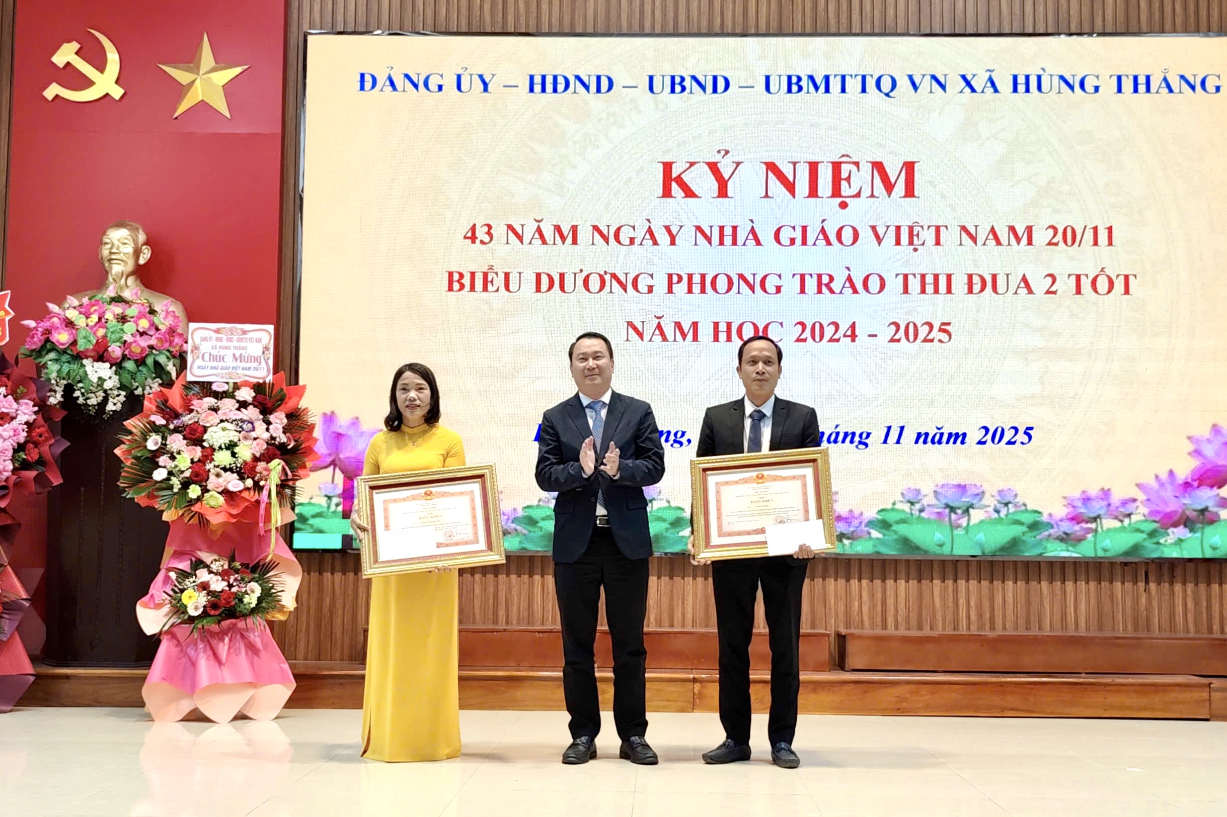 Lãnh đạo xã Hùng Thắng trao Bằng khen, Giấy khen cho các nhà giáo.Năm học 2024–2025, giáo dục xã Hùng Thắng đạt nhiều kết quả nổi bật. Chất lượng giáo dục đại trà và mũi nhọn ổn định; bậc tiểu học, THCS đạt 32 giải quốc gia, 34 giải thành phố, 164 giải huyện; bậc THPT có 5 giải quốc gia, 56 giải thành phố. Kỳ thi đại học năm 2025 ghi nhận 164 học sinh đỗ đại học.